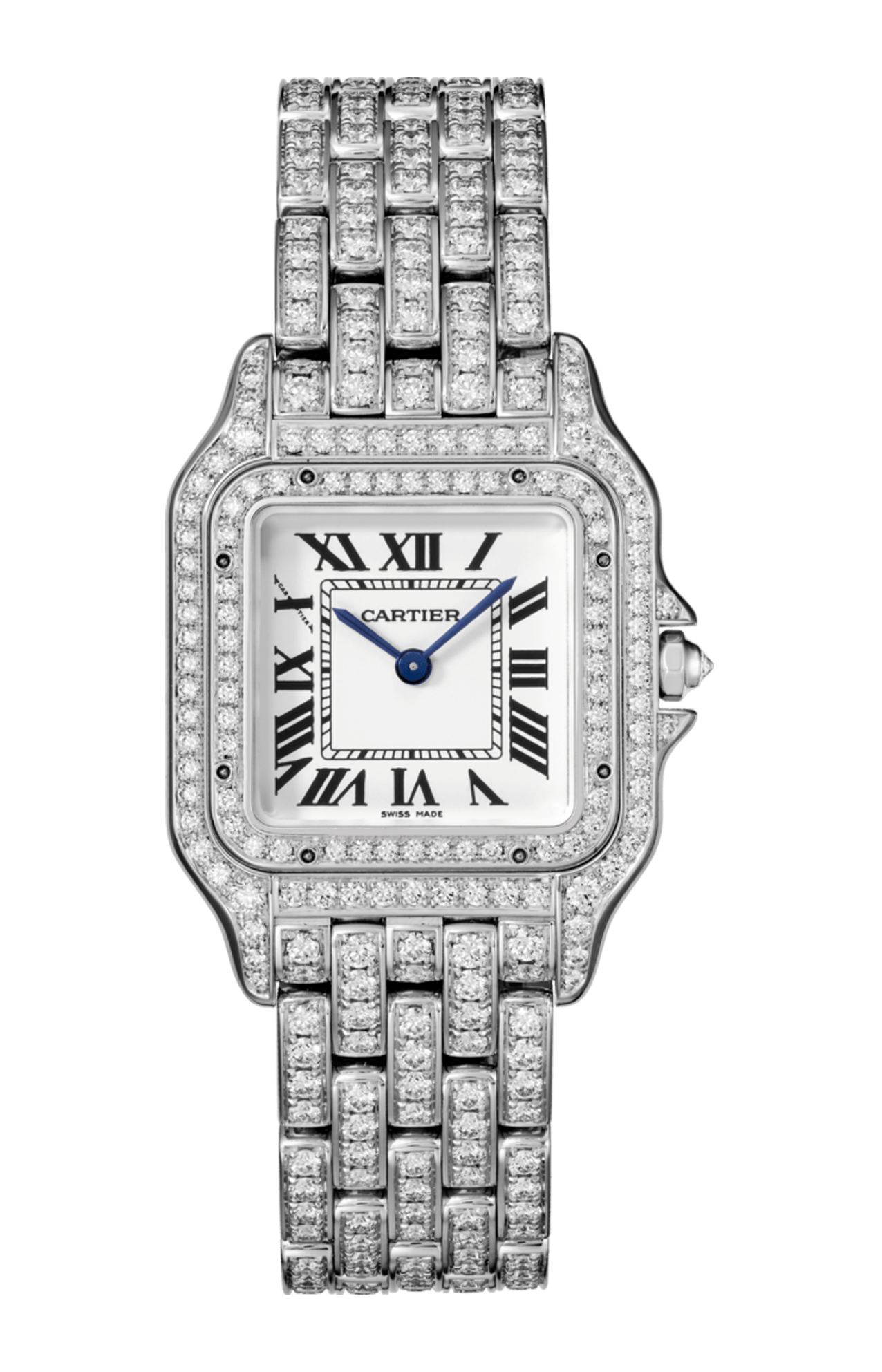 Orologio Panthère de Cartier, modello medio, movimento a quarzo. Cassa e bracciale in oro bianco rodiato 750/1000 ornati di 415 diamanti taglio brillante (7,80 carati). Corona ornata di un diamante, lancette a forma di gladio d'acciaio azzurrato. Dimensioni 37 x 29 mm, spessore 6 mm. Impermeabile fino a 30 metri.