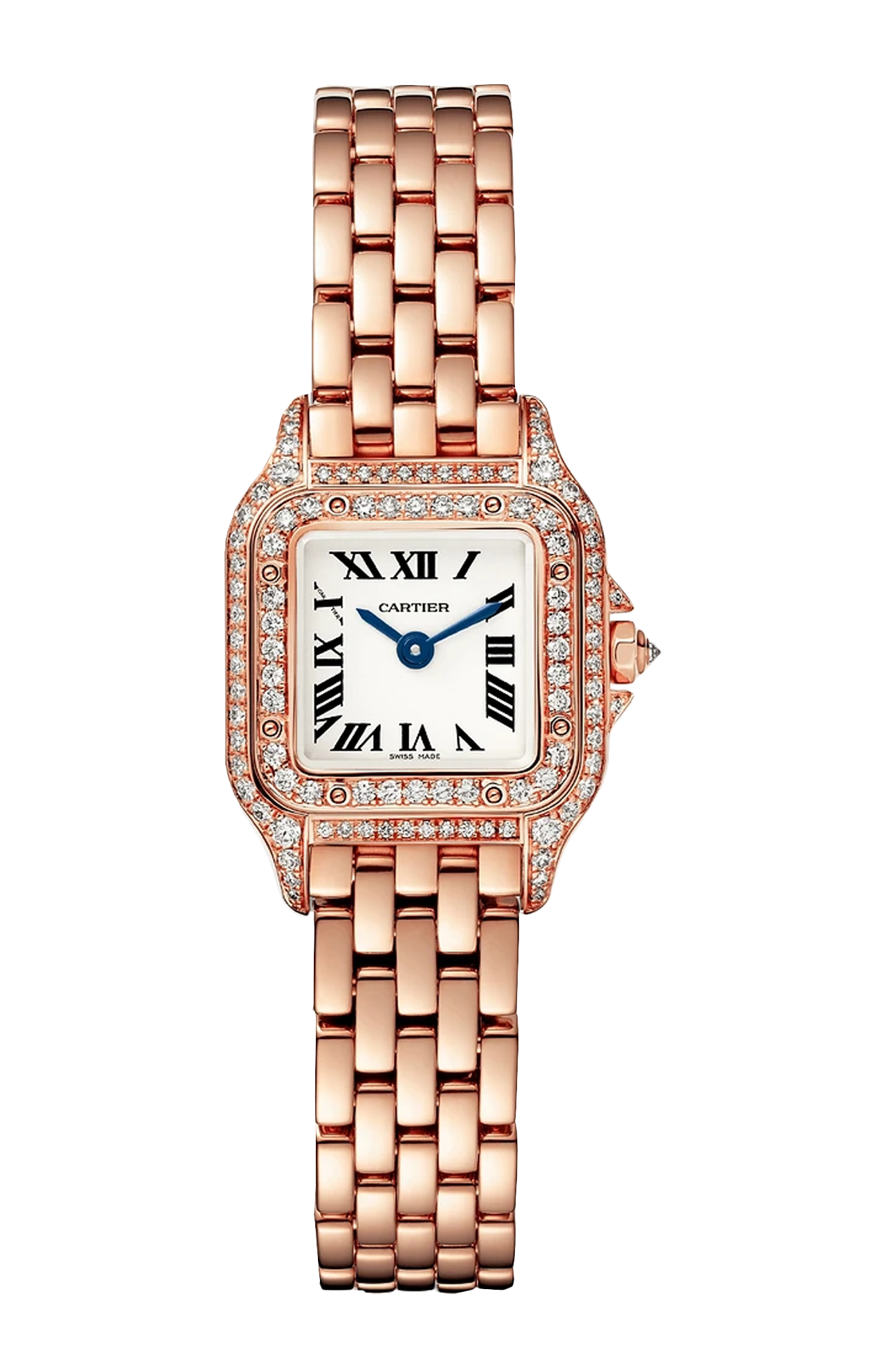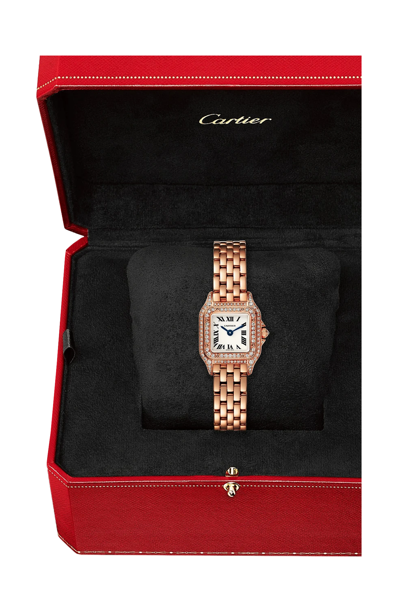 Orologio Panthère de Cartier, modello mini, movimento a quarzo. Cassa in oro rosa 750/1000 ornata di diamanti taglio brillante. Corona ottagonale in oro rosa 750/1000 ornata di un diamante taglio brillante. Quadrante argentato, lancette a forma di gladio d’acciaio azzurrato, vetro zaffiro. Bracciale in oro rosa 750/1000. Dimensioni 25 x 20 mm, spessore 6 mm. Impermeabile fino a 30 metri.