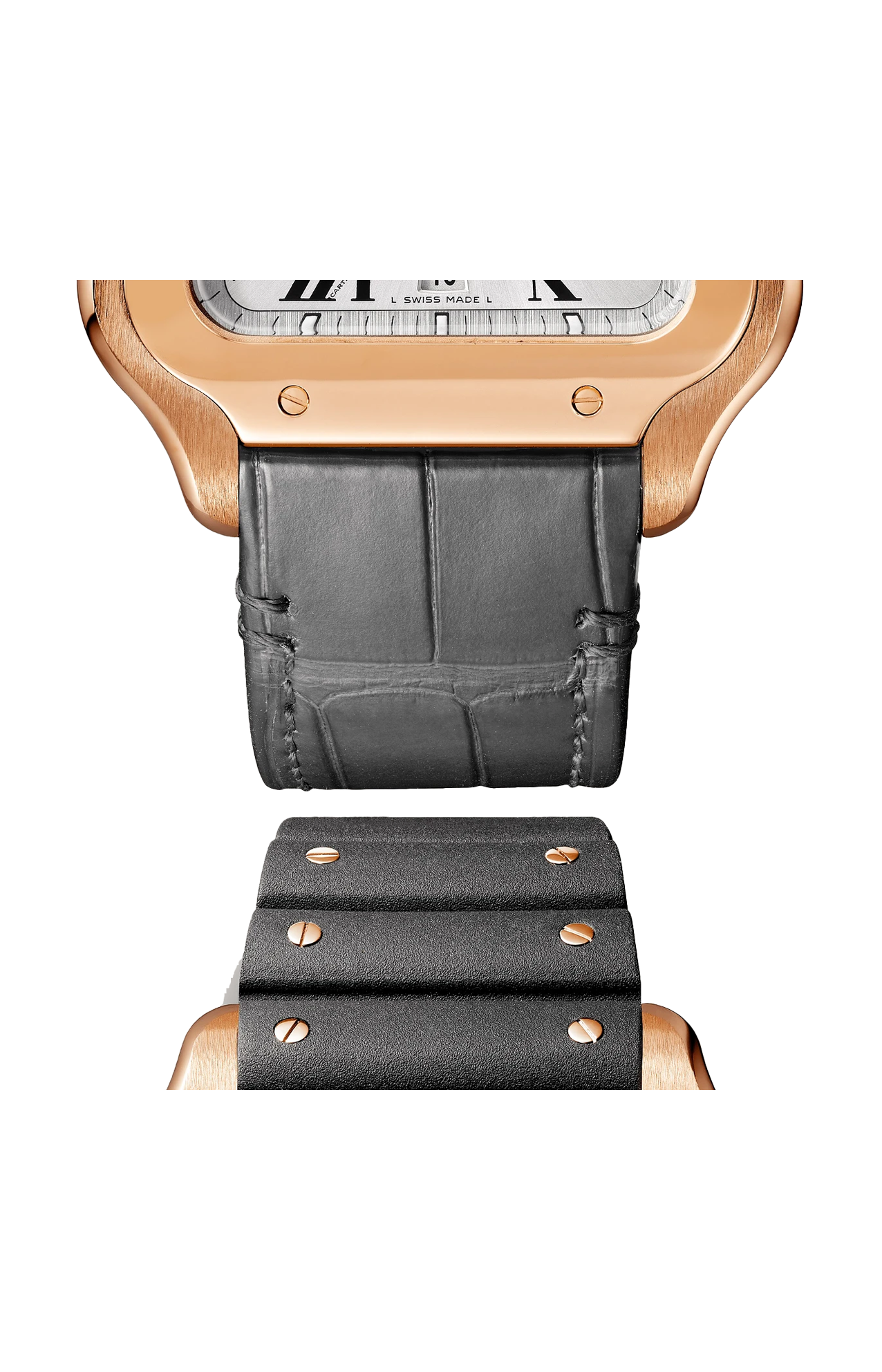 Orologio Santos, modello extra-large, movimento meccanico cronografo a carica automatica, calibro 1904 CH MC. Cassa in oro rosa 750/1000, corona ettagonale ornata di uno zaffiro sfaccettato, quadrante argentato satinato, lancette luminose a forma di gladio d’acciaio nero, vetro zaffiro. Primo cinturino d’alligatore semi-opaco grigio scuro, secondo cinturino in caucciù, fibbia pieghevole in oro rosa 750/1000. Entrambi sono dotati del sistema d’intercambiabilità QuickSwitch. Larghezza della cassa 43,3 mm, spessore 12,4 mm. Impermeabile fino a 100 metri.