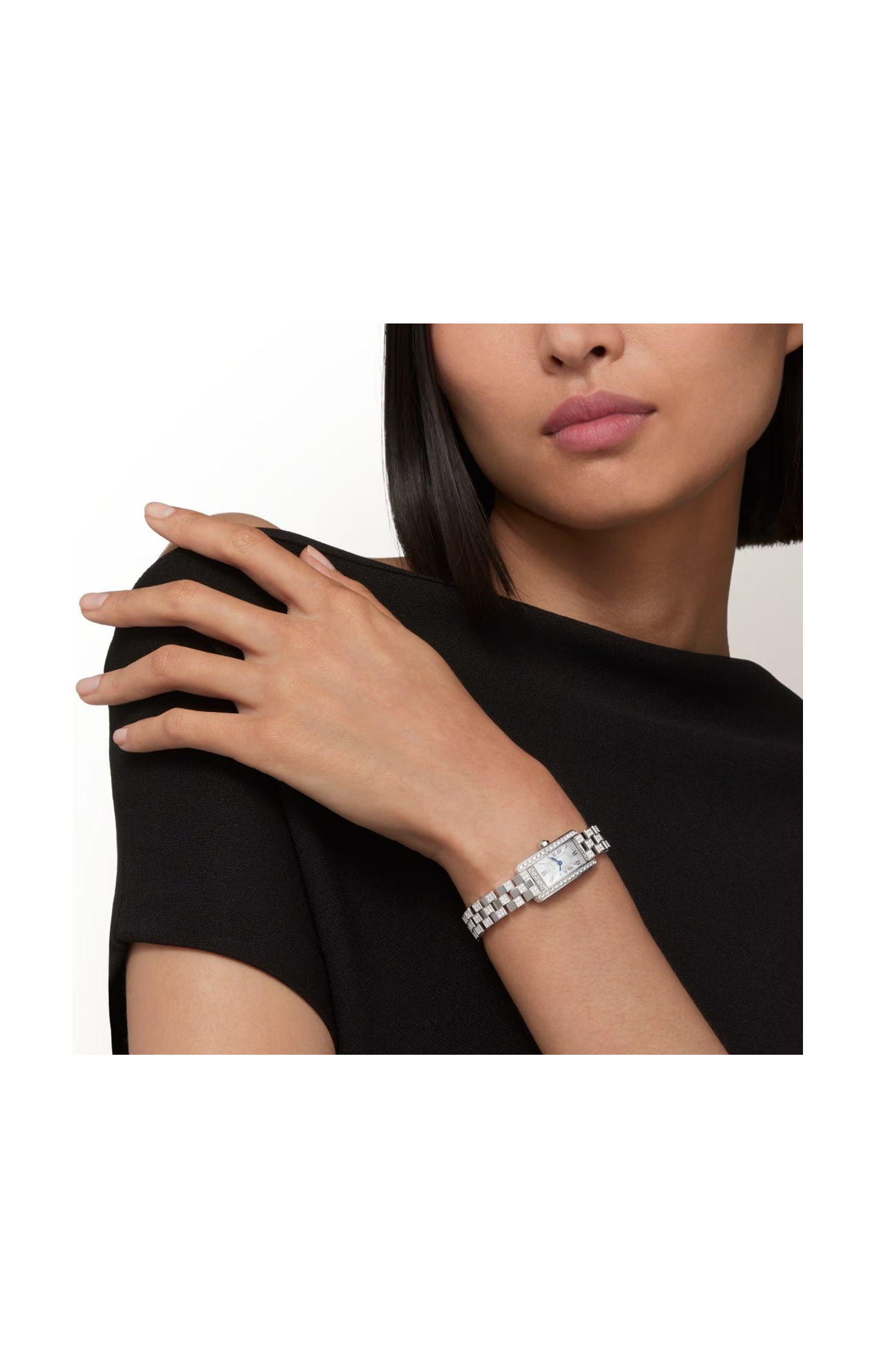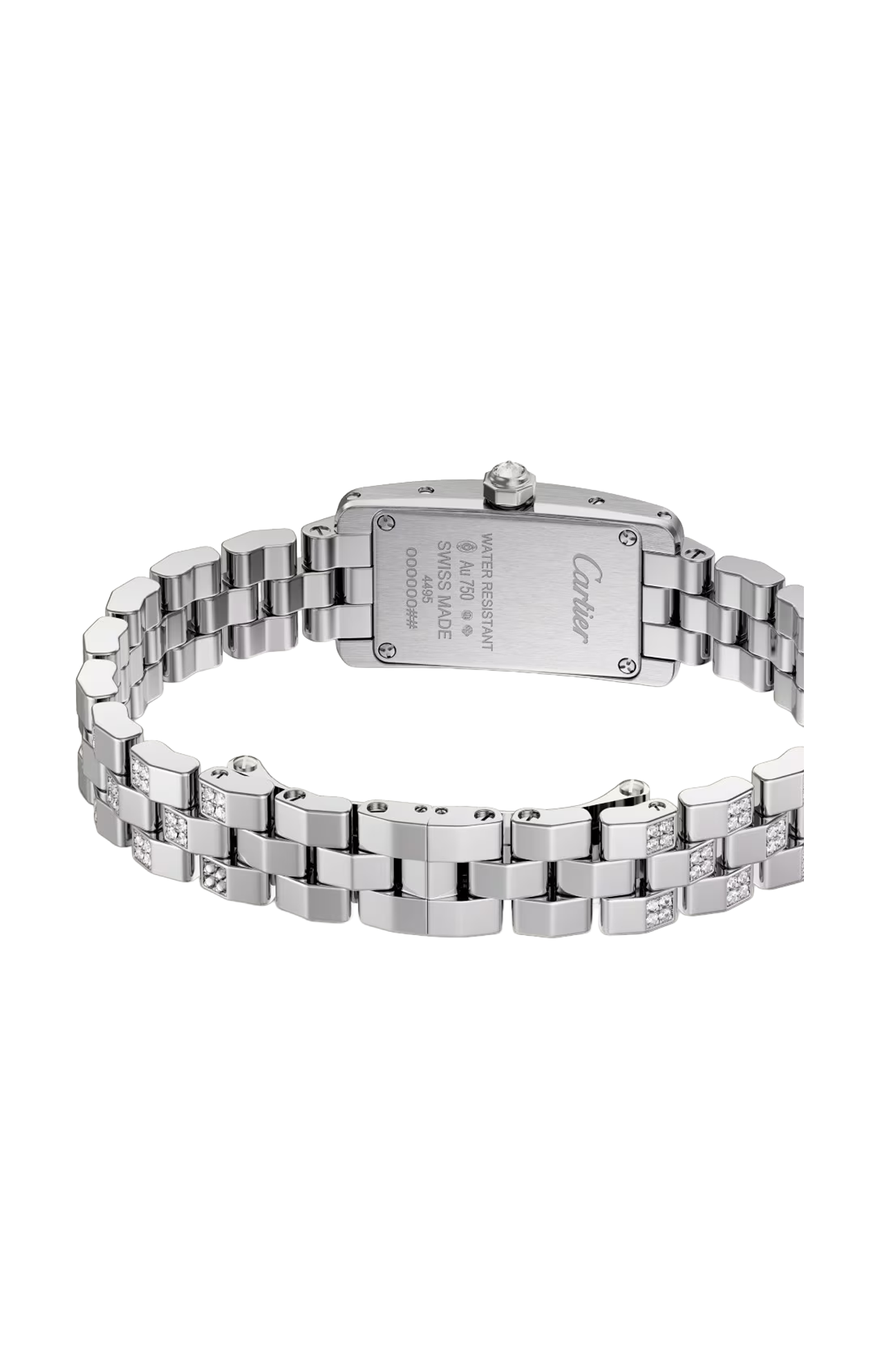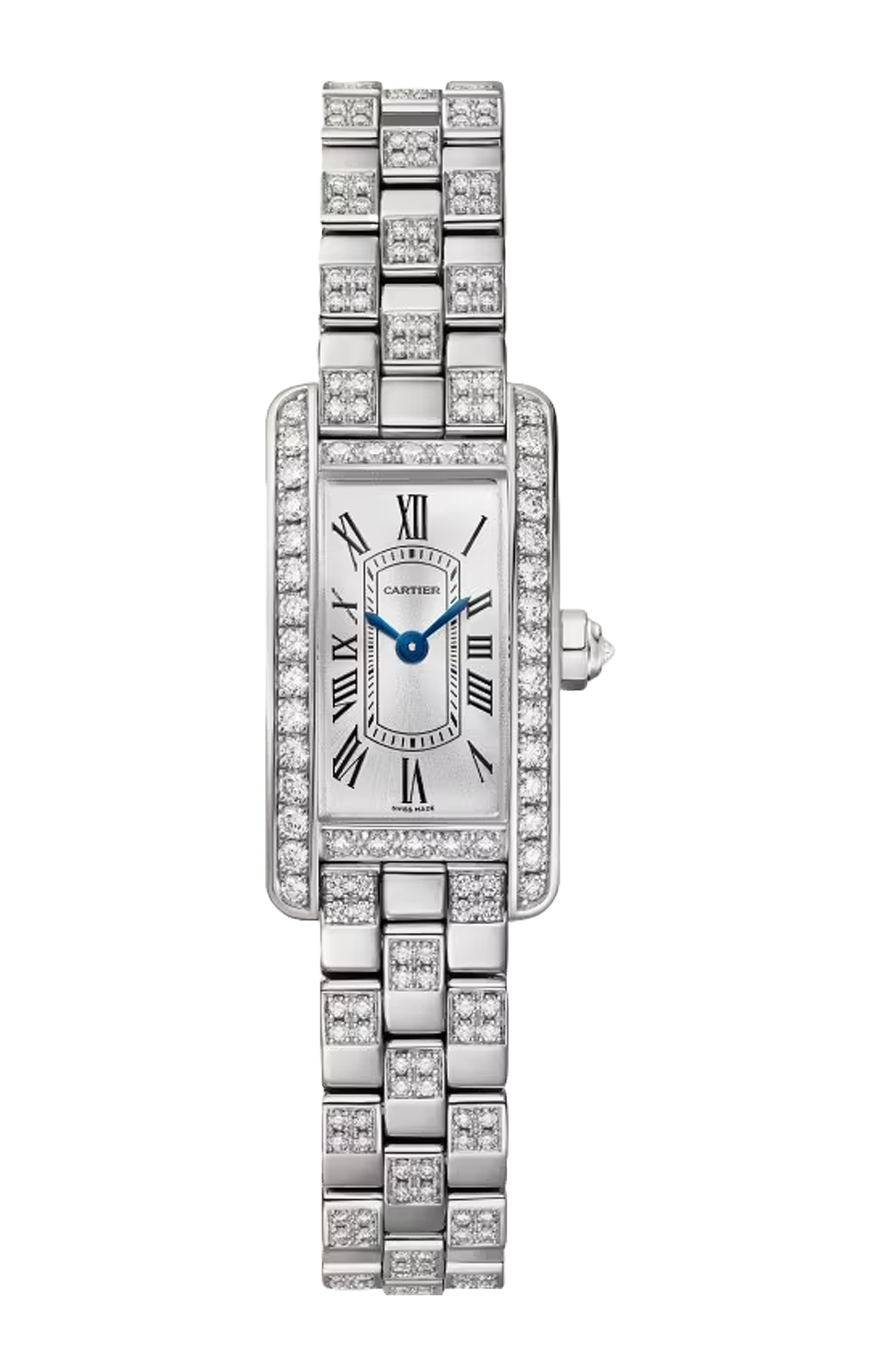Disegnato da Louis Cartier nel 1917, l’orologio Tank è un’icona orologiera moderna. Un orologio-bracciale la cui identità è definita dalla scelta di un design essenziale, che abbina geometria e proporzioni precise. Immediatamente riconoscibile e sempre al passo con i tempi, il Tank è stato reinterpretrato per oltre un secolo in una serie di varianti che rimangono fedeli allo spirito del design originale, come dimostrano il Tank Cintrée, il Tank Chinoise, il Tank Américaine e il Tank Française. Orologio Tank Américaine, modello mini, movimento al quarzo. Cassa in oro bianco 750/1000 ornata di 40 diamanti taglio brillante (0,50 carati). Dimensioni della cassa: 28 x 15,2 mm, spessore: 6,5 mm. Quadrante argentato con finitura satinata ed effetto soleil. Corona ottagonale in oro bianco 750/1000 ornata di un diamante con padiglione invertito. Lancette a forma di gladio d’acciaio azzurrato. Bracciale in oro bianco 750/1000 semi-ornato di 168 diamanti pavé brillante (0,83 carati). Impermeabile fino a 30 metri.