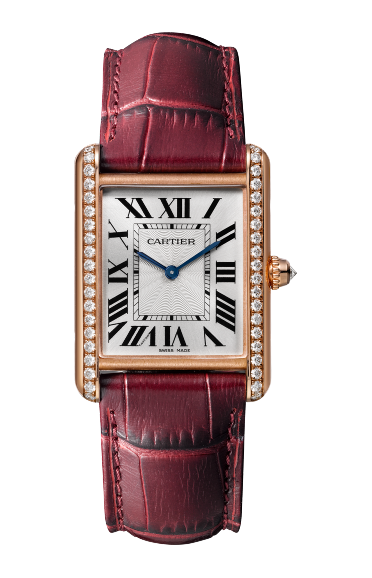 Orologio Tank Louis Cartier, modello grande, movimento meccanico di manifattura a carica manuale. Cassa e corona perlata in oro rosa 750/1000 ornate di 41 diamanti taglio brillante (0,66 carati). Quadrante perlato argentato, lancette a forma di gladio d’acciaio azzurrato, vetro minerale, cinturino d’alligatore color vinaccia, fibbia ardiglione in oro rosa 750/1000. Dimensioni della cassa 33,7 x 25,5 mm, spessore 6,6 mm. Impermeabile fino a 30 metri.