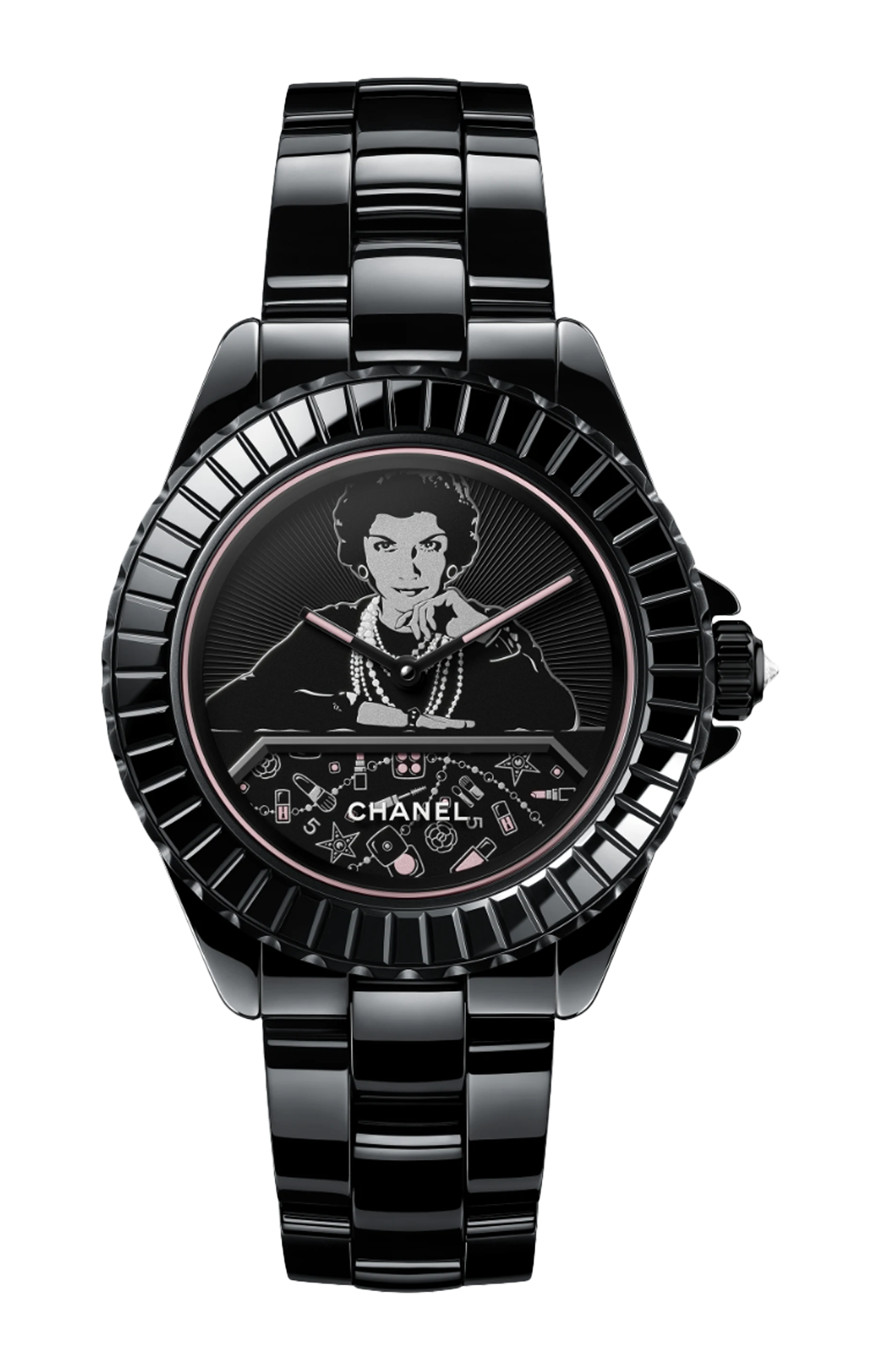 L’orologio Mademoiselle J12 Blush calibro 12.1 di Chanel è un’interpretazione raffinata del segnatempo iconico, pensata per chi desidera distinguersi con eleganza. La cassa da 38 mm combina ceramica nera ad alta resistenza e acciaio con rivestimento nero opaco, conferendo solidità e un’eleganza discreta. La lunetta fissa in acciaio, finitura nera opaca, è arricchita da un vetro zaffiro verniciato nero con motivo baguette che aggiunge profondità e un tocco di luce. Corona non avvitata in acciaio rivestito nero decorata da un diamante taglio brillante da circa 0,16 carati che impreziosisce il profilo. Sul quadrante la silhouette fissa di Mademoiselle perfettamente integrata con un disco girevole verniciato nero decorato con motivi argentati e rosati, ispirati alle palette make‑up di Chanel, che compie un giro completo in 5 minuti: un dettaglio inedito che unisce estetica e movimento. Il cuore dell’orologio è il calibro automatico 12.1, con circa 70 ore di riserva di carica, per prestazioni elevate. Ore e minuti le funzioni, rifinite senza compromessi. Bracciale in ceramica nera ad alta resistenza con chiusura tripla pieghevole in acciaio, per comfort e continuità stilistica. Impermeabile fino a 50 metri, è pensato per accompagnare con stile la quotidianità pur mantenendo la misura dell’alta orologeria.