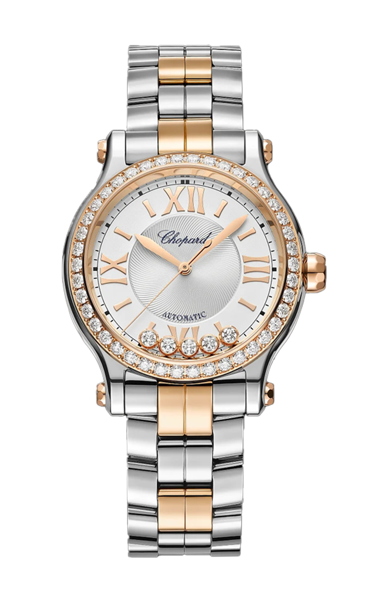 La collezione Happy Sport è l'emblema della creatività e dell'audacia di Chopard. Le sue gioiose pietre preziose, che danzano liberamente tra due vetri zaffiro, fanno sognare sin dal 1993, quando Chopard è diventata la prima maison a coniugare acciaio e diamanti. La grande competenza orologiera ha consentito a Chopard di dotare il modello Happy Sport da 33 mm di un movimento meccanico a carica automatica appositamente sviluppato per le casse dei modelli femminili. Little diamonds do great things.