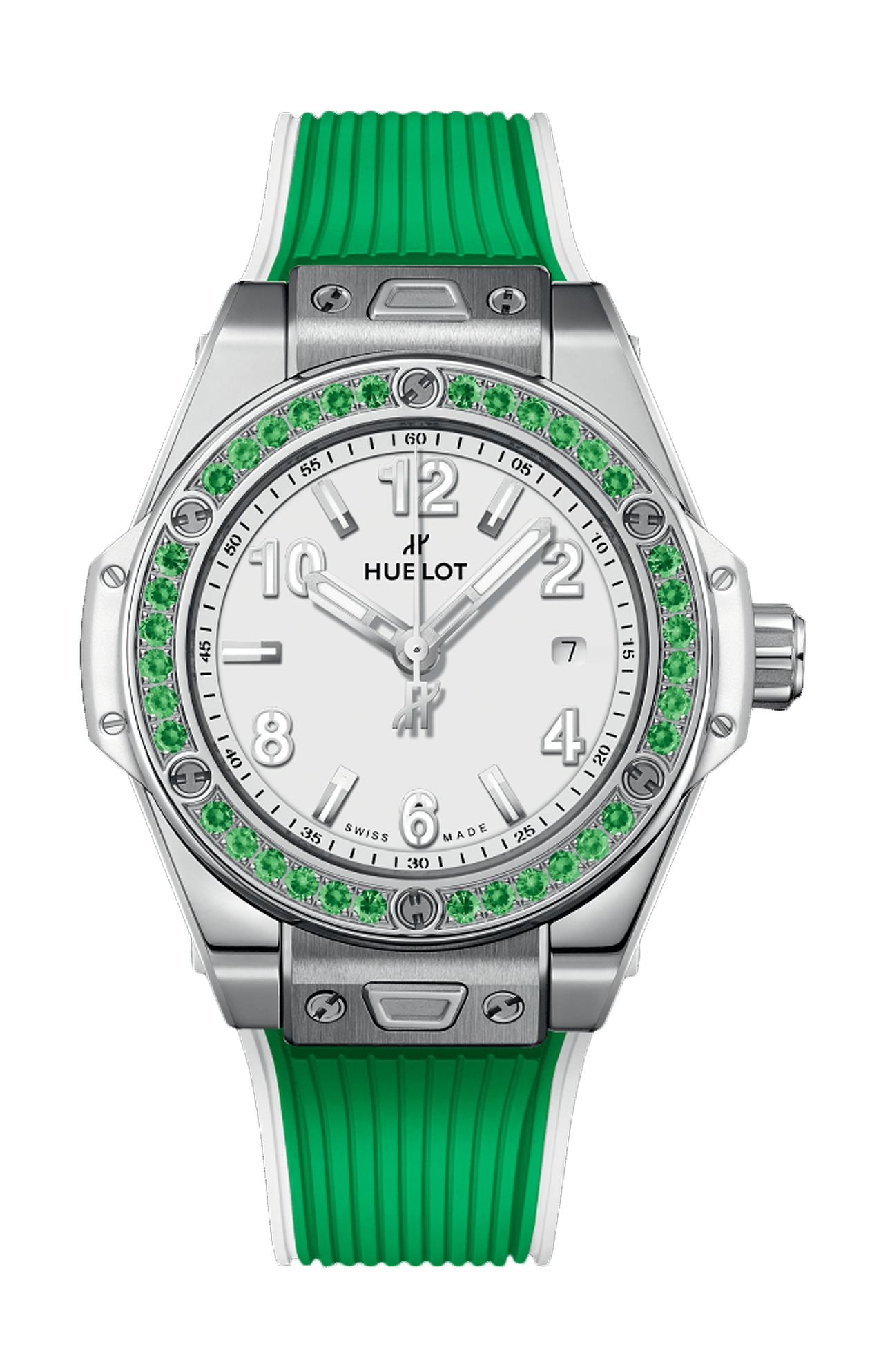 Hublot utilizza esclusivamente un acciaio 316L di grado medico e non ossidante, combinando il ferro come metallo di base, il cromo per la sua resistenza alla corrosione e il nichel per una robustezza meccanica ottimale. Questa lega stabile e durevole resiste perfettamente a tutti i rischi della vita quotidiana. Dal punto di vista estetico, è facilmente "decorabile": sia tramite lucidatura che satinatura, consente di ottenere finiture delicatamente alternate. Secondo cinturino tutto verde incluso.
