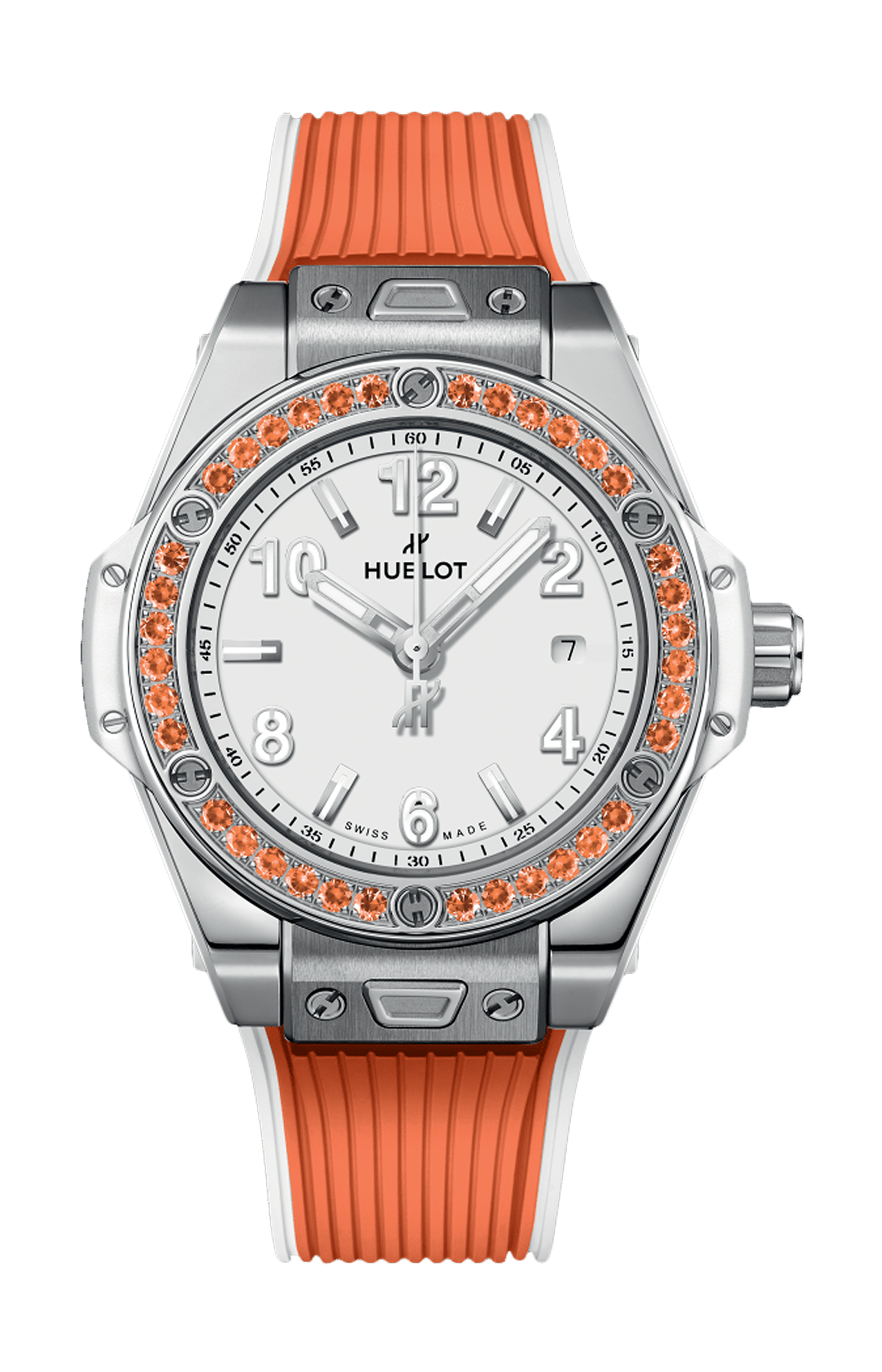Hublot utilizza esclusivamente un acciaio 316L di grado medico e non ossidante, combinando il ferro come metallo di base, il cromo per la sua resistenza alla corrosione e il nichel per una robustezza meccanica ottimale. Questa lega stabile e durevole resiste perfettamente a tutti i rischi della vita quotidiana. Dal punto di vista estetico, è facilmente "decorabile": sia tramite lucidatura che satinatura, consente di ottenere finiture delicatamente alternate. Secondo cinturino tutto arancione incluso.