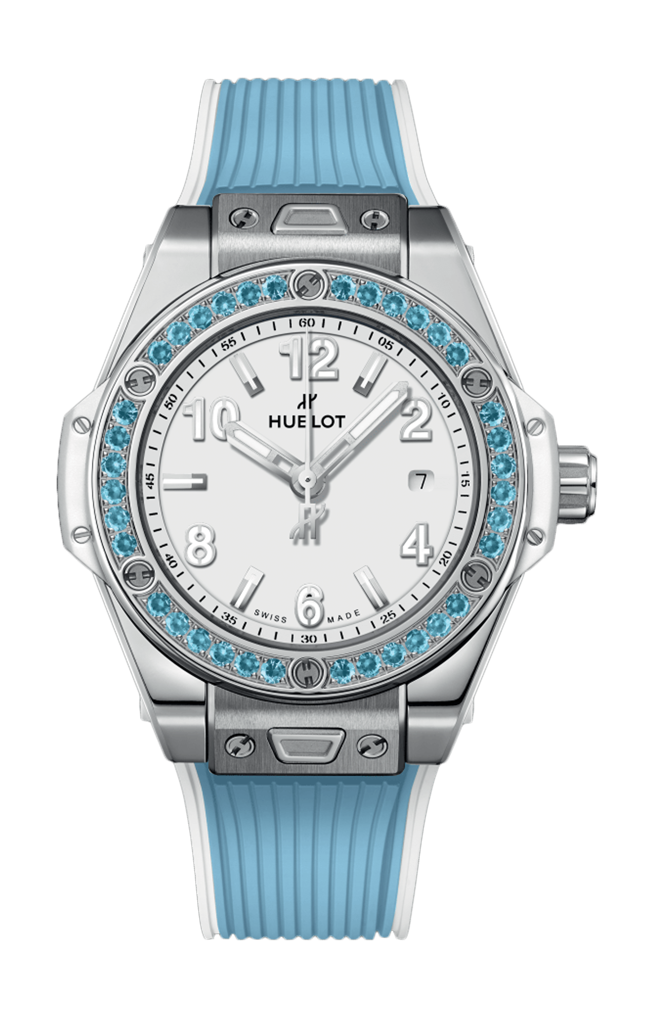 Hublot utilizza esclusivamente un acciaio 316L di grado medico e non ossidante, combinando il ferro come metallo di base, il cromo per la sua resistenza alla corrosione e il nichel per una robustezza meccanica ottimale. Questa lega stabile e durevole resiste perfettamente a tutti i rischi della vita quotidiana. Dal punto di vista estetico, è facilmente "decorabile": sia tramite lucidatura che satinatura, consente di ottenere finiture delicatamente alternate. Secondo cinturino tutto blu cielo incluso.