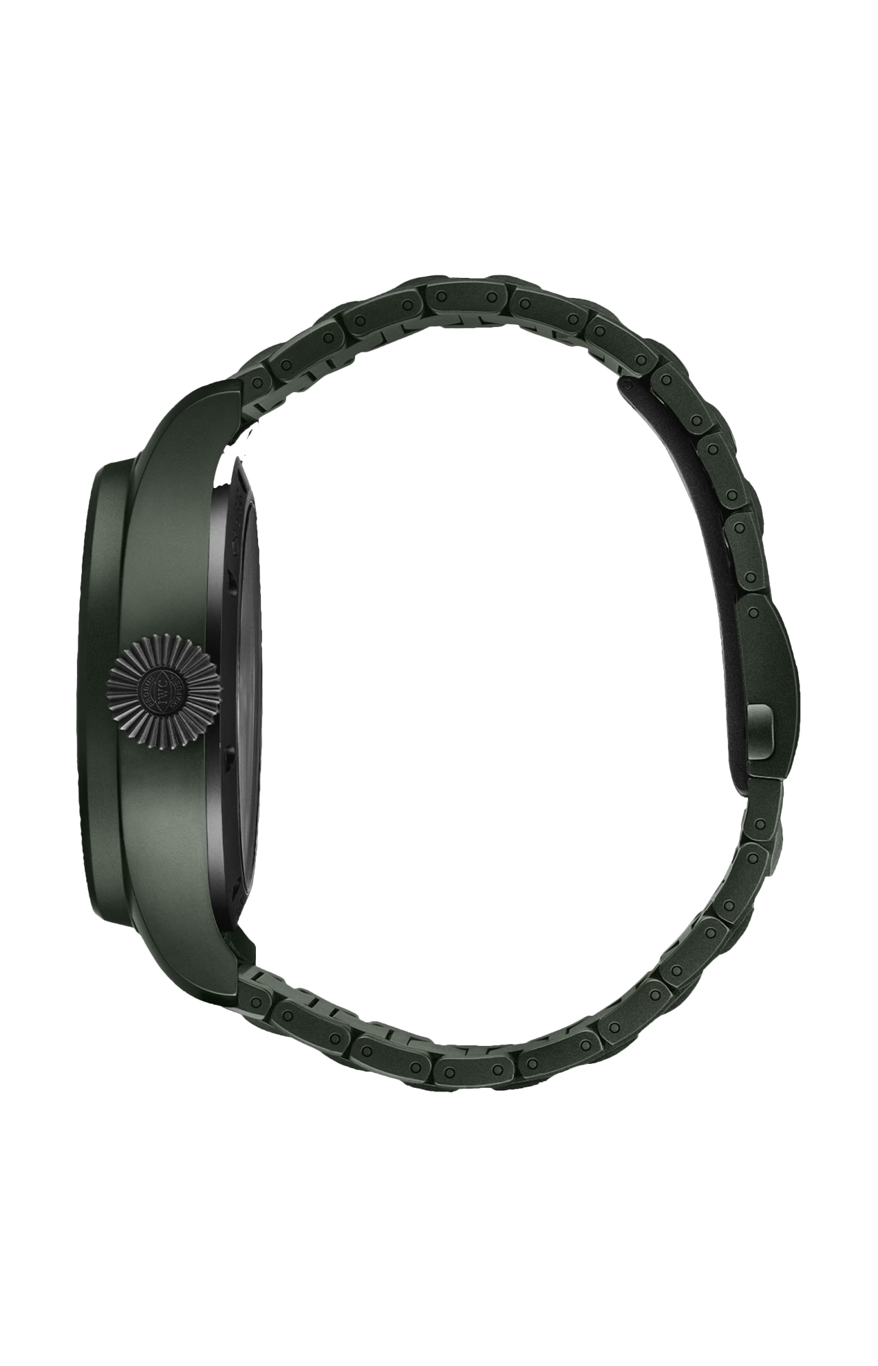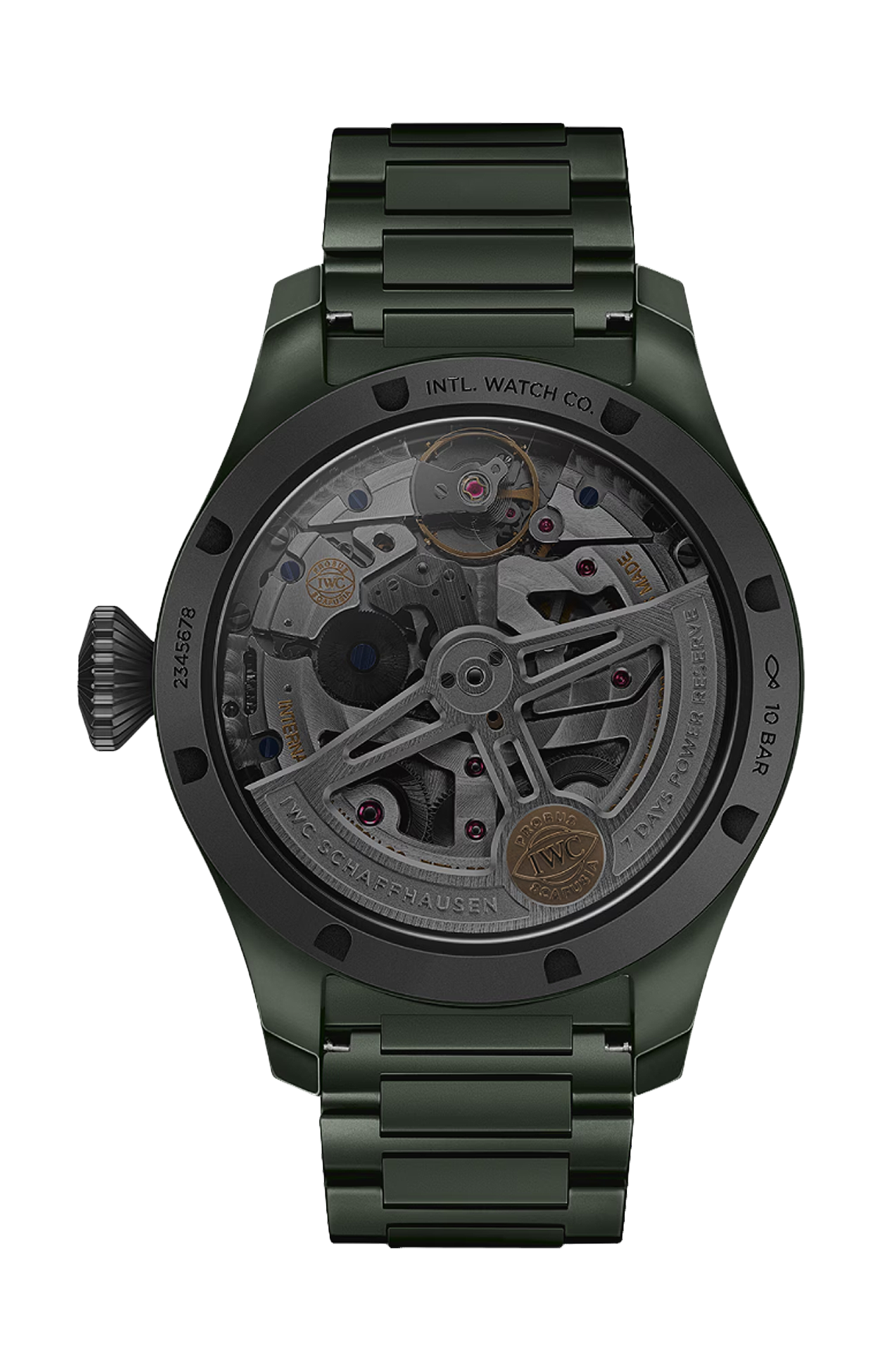 Il Big Pilot’s Watch Perpetual Calendar Top Gun Woodland presenta una cassa da 46,5 millimetri in ceramica verde, ispirata alle tute di volo dei piloti della marina e ai vasti paesaggi forestali che questi piloti d’élite sorvolano. Per questo orologio IWC Schaffhausen ha realizzato per la prima volta un bracciale in ceramica. Grazie alla leggerezza della ceramica, il bracciale è estremamente confortevole al polso. Il bracciale con maglie ad H è costituito con 38 parti in ceramica, prodotte mediante un elaborato processo. I materiali grezzi in polvere sono modellati in un “corpo verde” e poi lavorati per ottenere la forma finale. Durante la successiva fase di sinterizzazione, i pezzi si riducono di circa un terzo. Questa riduzione delle dimensioni deve essere presa in considerazione già nella fase di progettazione. L’anello del fondello e la corona sono realizzati in Ceratanium®, un materiale sviluppato da IWC che combina la leggerezza e la struttura del titanio con una durezza e una resistenza ai graffi simili a quelle della ceramica. Il calendario perpetuo riconosce in automatico la diversa lunghezza dei mesi e aggiunge un giorno bisestile ogni quattro anni alla fine di febbraio. Sarà necessaria una regolazione manuale solo nei secoli in cui l’anno bisestile viene saltato, ad esempio nell’anno 2100. La doppia indicazione delle fasi lunari Double Moon™ mostra la luna vista dagli emisferi nord e sud. Grazie a uno speciale ingranaggio di riduzione, le fasi lunari sono così precise che presentano uno scarto di un solo giorno ogni 577,5 anni. Dotato di un sistema di ricarica Pellaton con componenti in ceramica, il calibro 52616 di manifattura IWC accumula una riserva di carica di 7 giorni in due bariletti. È possibile ammirare il movimento attraverso il fondello in vetro zaffiro colorato.