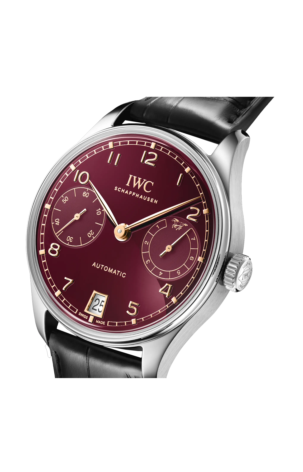 Il Portugieser Automatic 42 Year of the Horse presenta una cassa in acciaio inossidabile, un quadrante bordeaux e lancette e indici applicati dorati. La massa oscillante del calibro 52011 di manifattura IWC è sagomata a forma di cavallo al galoppo, in omaggio al Capodanno lunare.