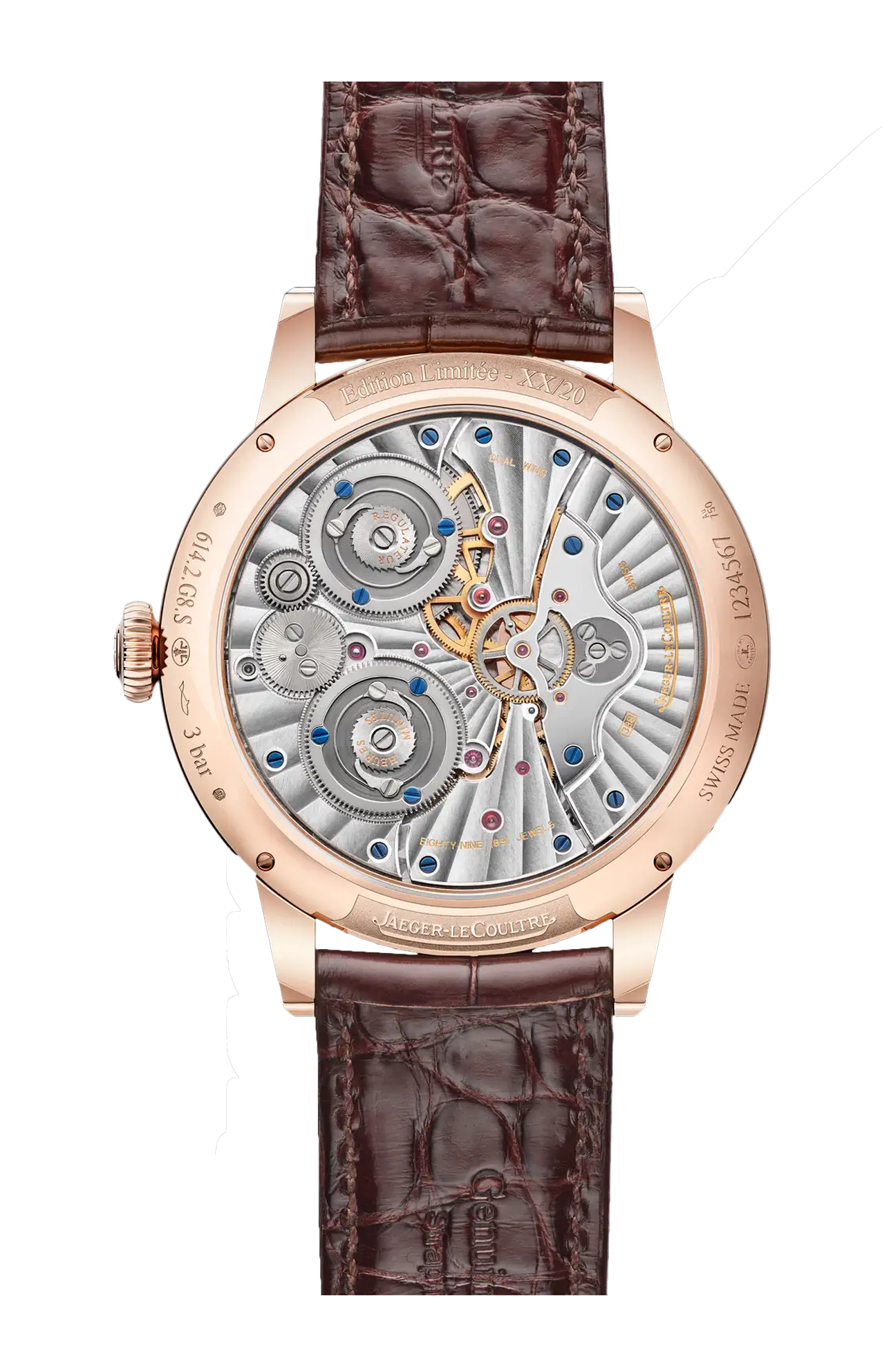 Eleganti decorazioni impreziosiscono anche il movimento, comprese le componenti non visibili attraverso il fondello in vetro zaffiro: le superfici spazzolate contrastano con il perlage, i bordi sono smussati e lucidati a mano, mentre le côtes de Genève a raggi di sole decorano armoniosamente l’intera superficie dei ponti. Edizione limitata a 20 esemplari