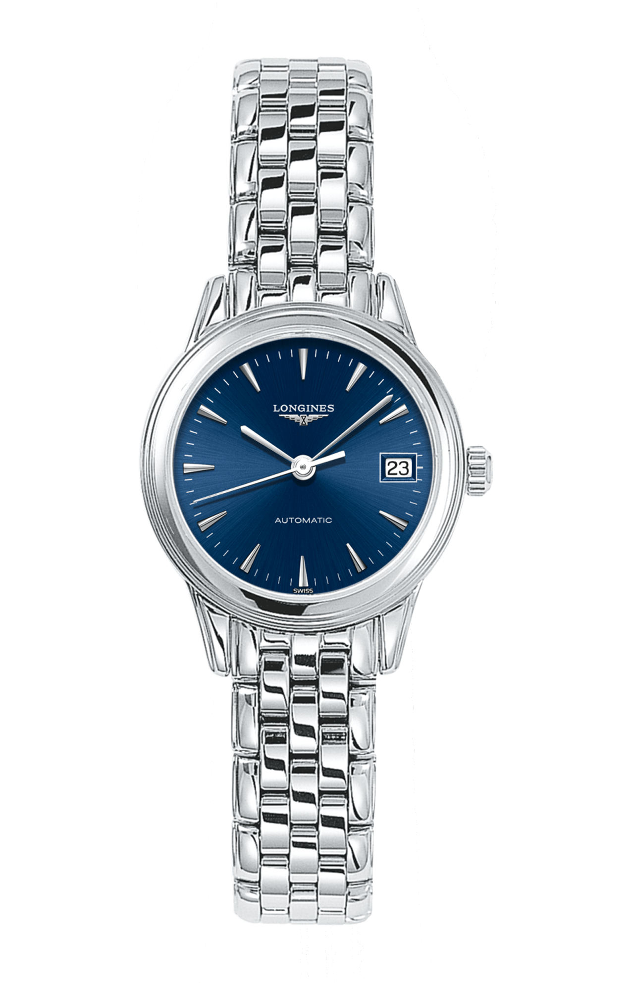 Orologio automatico, Ø 26.00 mm, acciaio inossidabile, L4.274.4.92.6. Date, movimento meccanico a carica automatica con frequenza di 28'800 alternanze orarie e riserva di carica di circa 45 ore, bilanciere-spirale in silicio monocristallino. Impermeabile fino a 3 bar, vetro zaffiro antigraffio bombato con trattamento antiriflesso multistrato sul lato interno. Quadrante blu a raggi di sole. Bracciale in acciaio inossidabile, con chiusura déployante a tripla sicurezza e meccanismo di apertura a pressione.