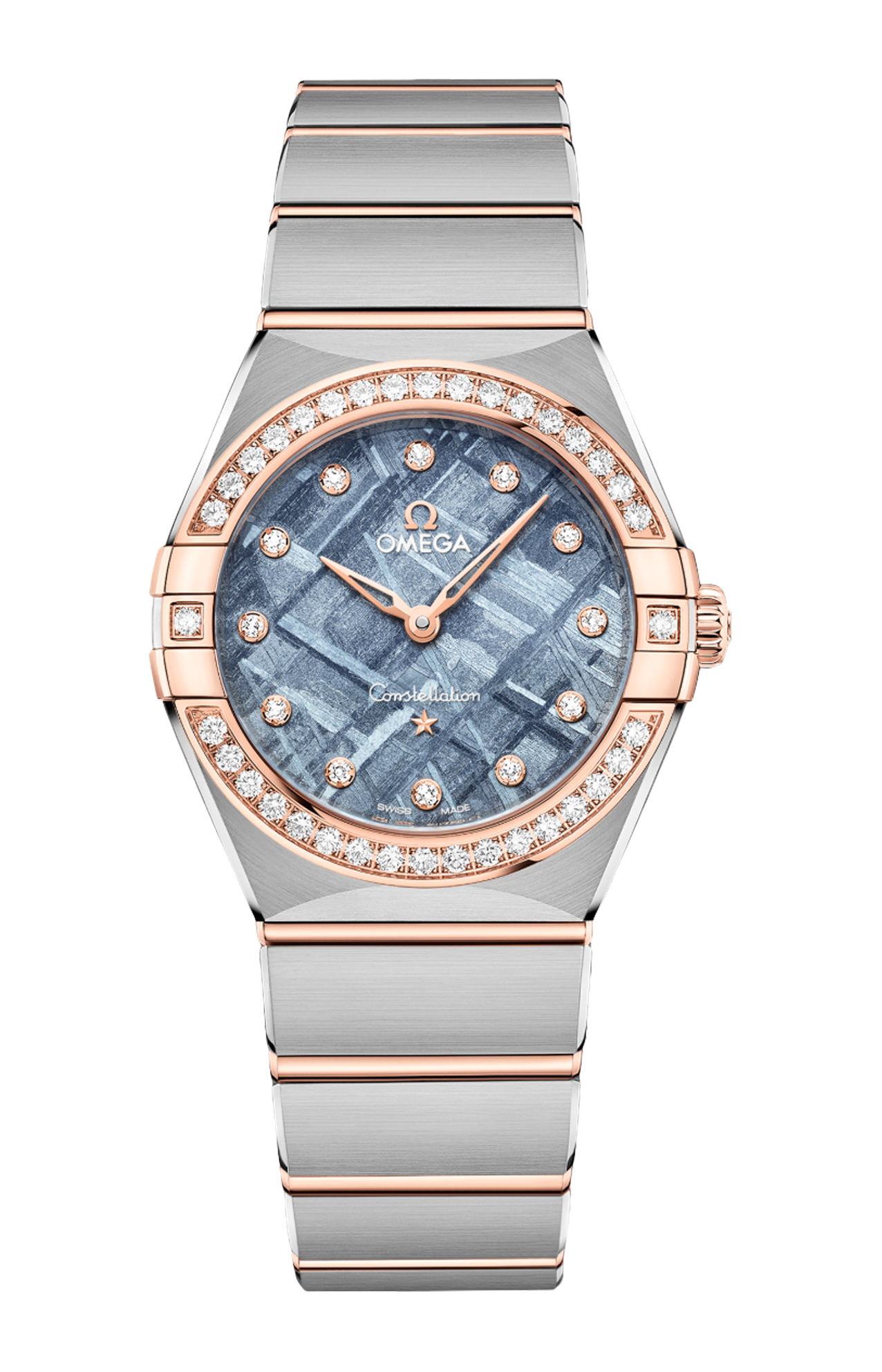 L’orologio presenta una cassa da 28 mm corredata da un bracciale “mono rang” in acciaio inossidabile e oro giallo 18K e integra molte delle caratteristiche distintive della linea Constellation, come le griffe lucide, le sfaccettature a mezzaluna e la lunetta tempestata di diamanti.