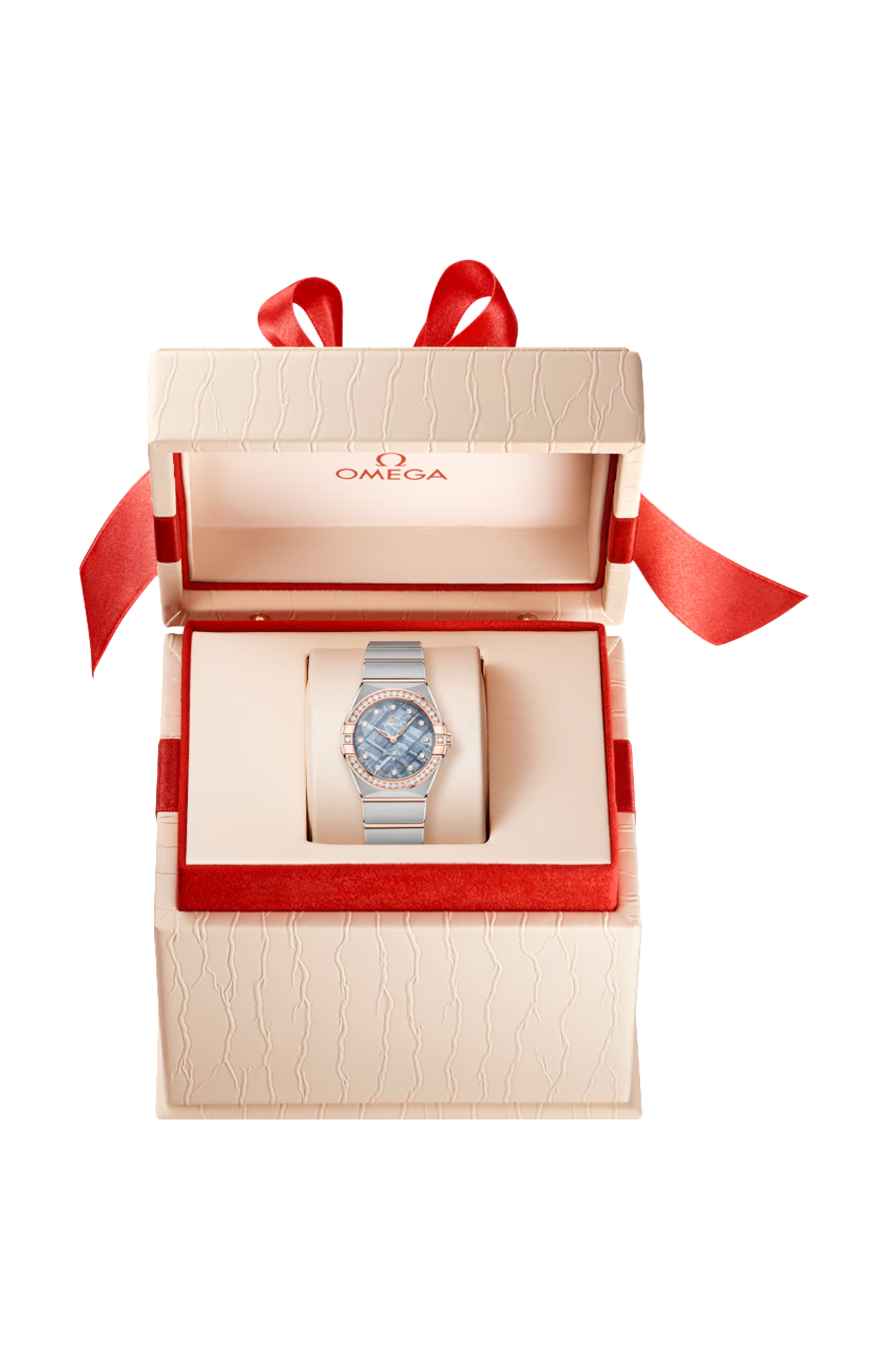 L’orologio presenta una cassa da 28 mm corredata da un bracciale “Mono Rang” in acciaio inossidabile e oro Sedna™ 18K e integra molte delle caratteristiche distintive della linea Constellation, come le griffe lucide, le sfaccettature a mezzaluna e la lunetta tempestata di diamanti.