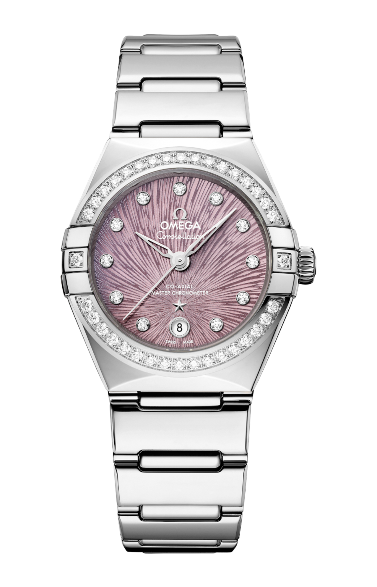 Unione di stile raffinato e precisione stellare, l'iconico Constellation di Omega è caratterizzato dalla celebre cassa con sfaccettature a mezzaluna e griffe lucide ai lati.