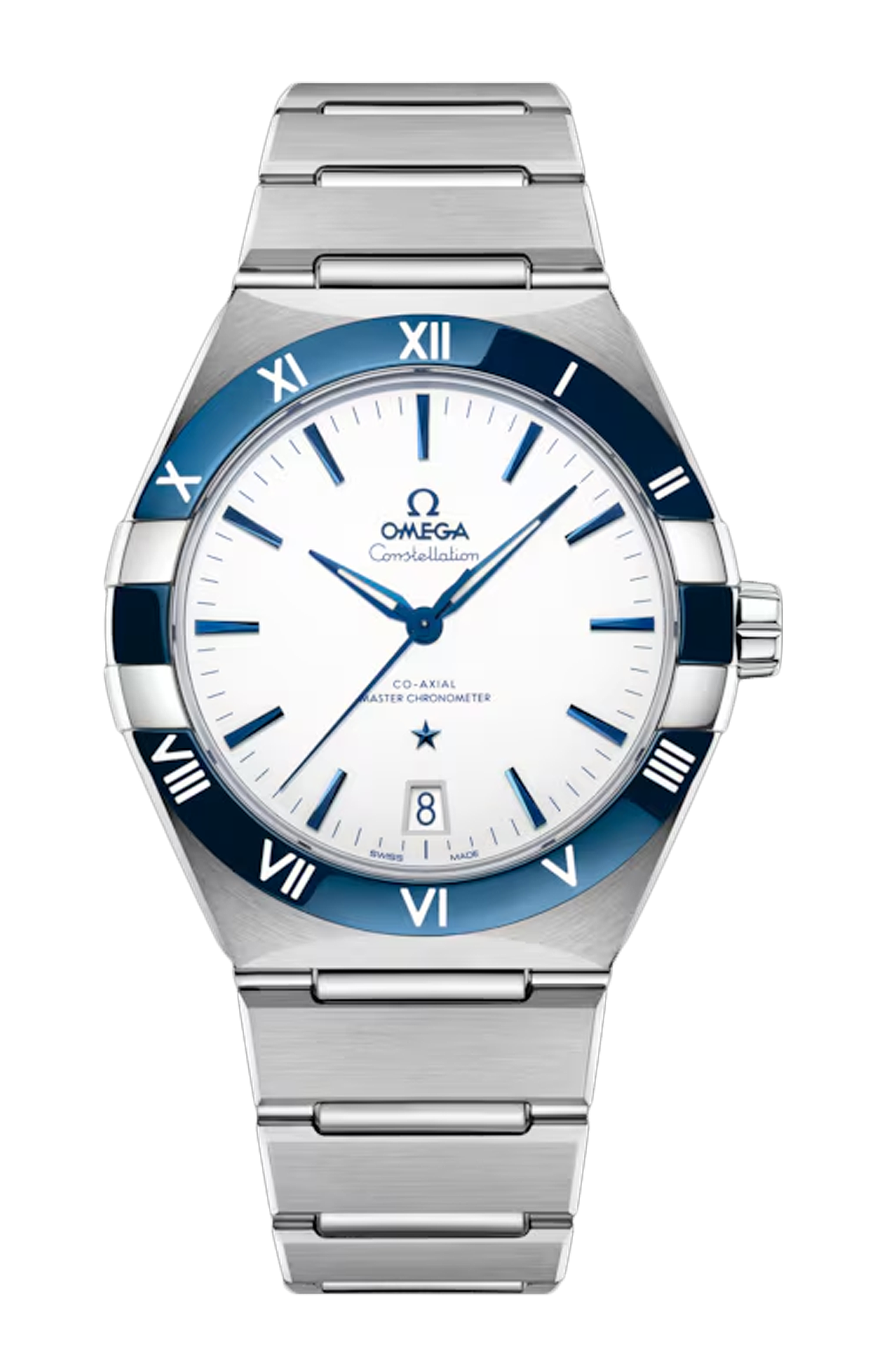 Questo modello da 41 mm in acciaio inossidabile presenta una lunetta in ceramica blu lucida con numeri romani in smalto bianco “grand feu”, un quadrante in ceramica bianca e un datario a finestrella a ore 6. Le lancette, il logo Omega, la stella Constellation e gli indici sfaccettati sono tutti azzurrati.