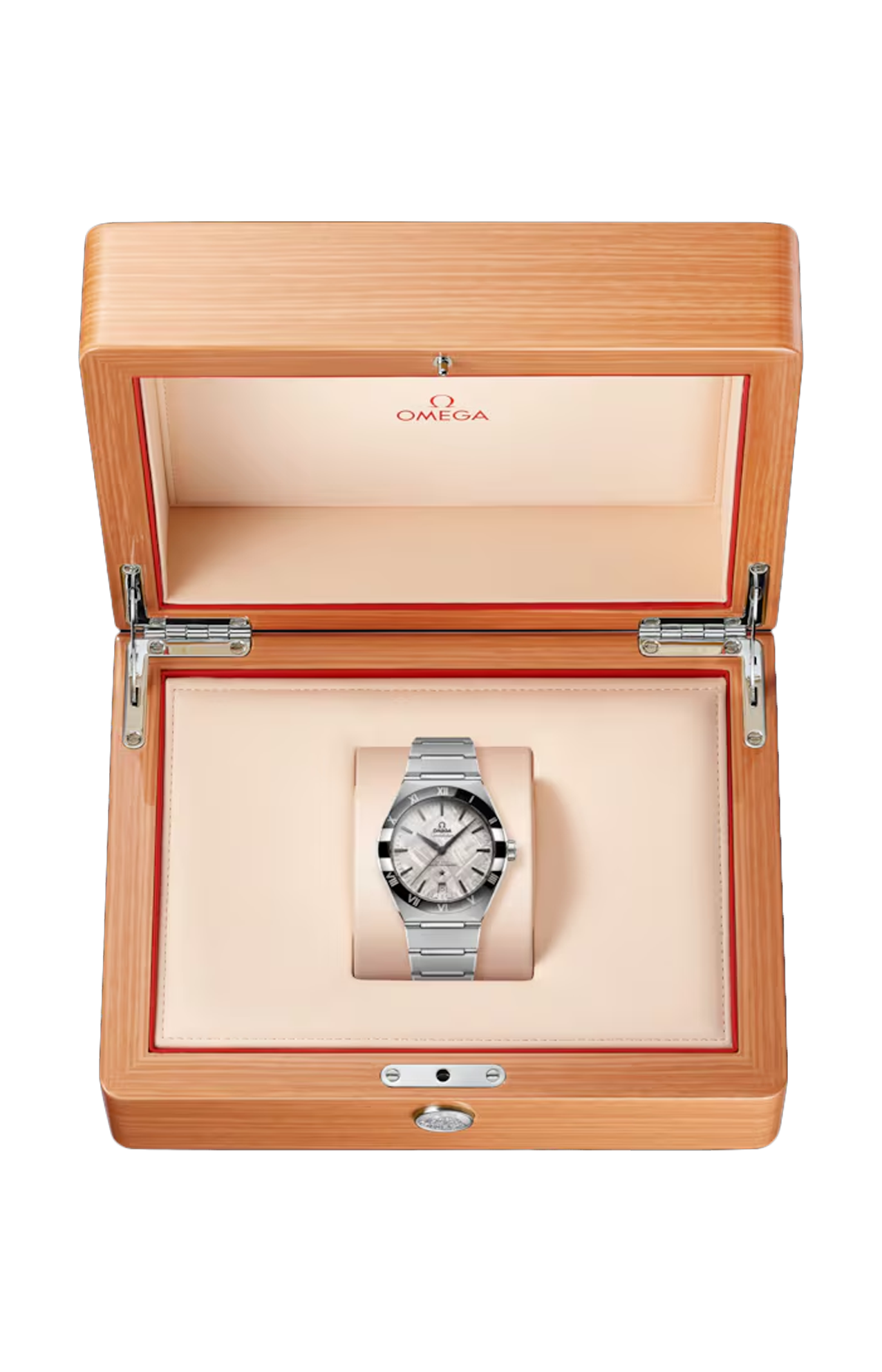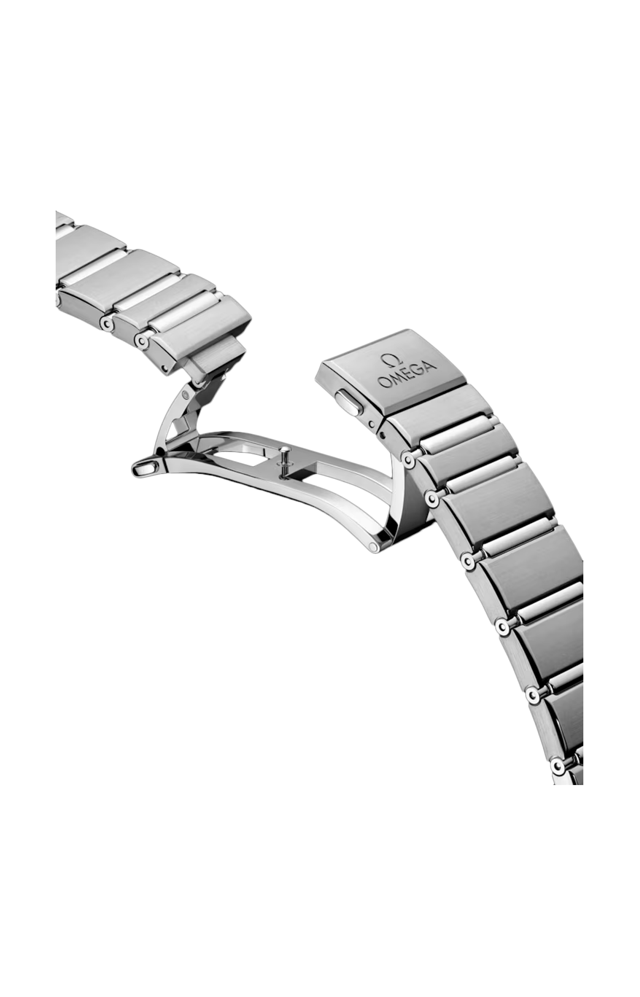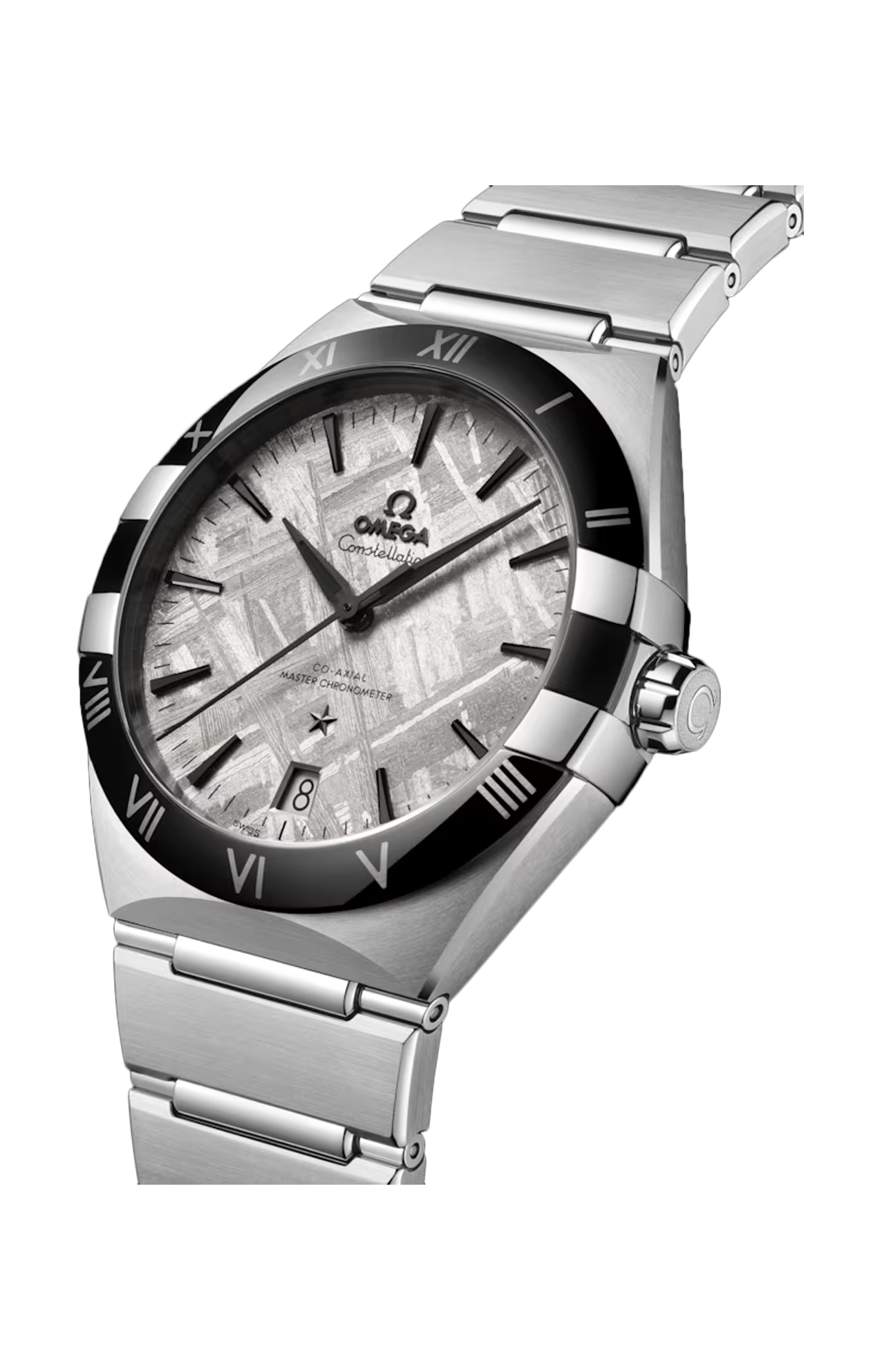 L’orologio presenta una cassa da 41 mm corredata da un bracciale “Mono Rang” in acciaio inossidabile e integra molte delle caratteristiche distintive della linea Constellation, come le griffe lucide, le sfaccettature a mezzaluna e i numeri romani in Liquidmetal™ sulla lunetta in ceramica nera.