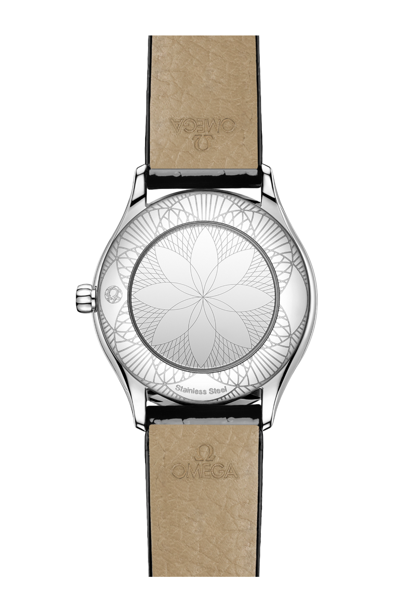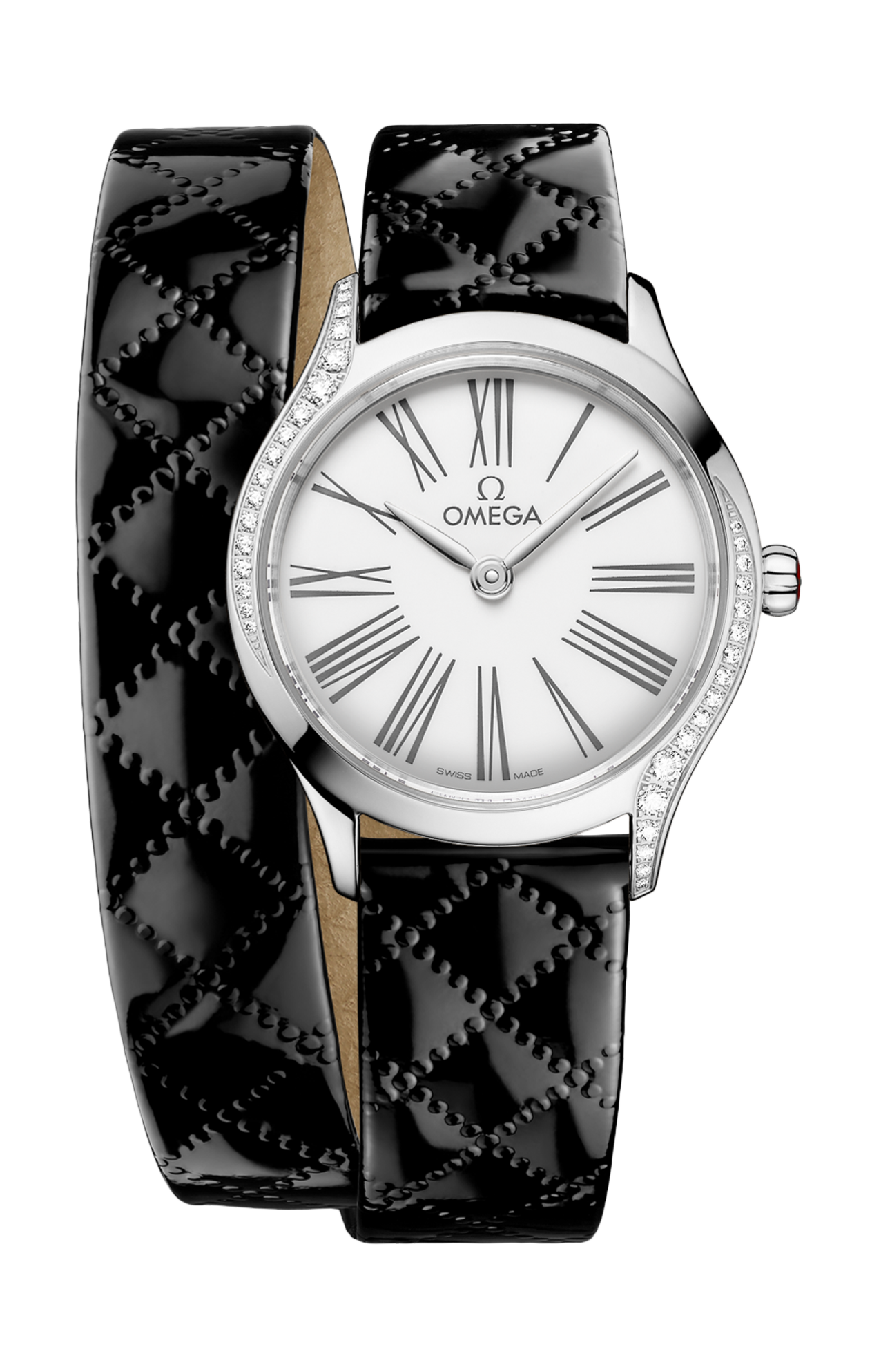 Corredato da un cinturino a doppio giro in pelle di vitello laccata nera con trapuntatura a diamante, l’orologio è animato dal calibro Omega 4061, alloggiato nello speciale fondello a specchio con motivo metallizzato “Her Time”.