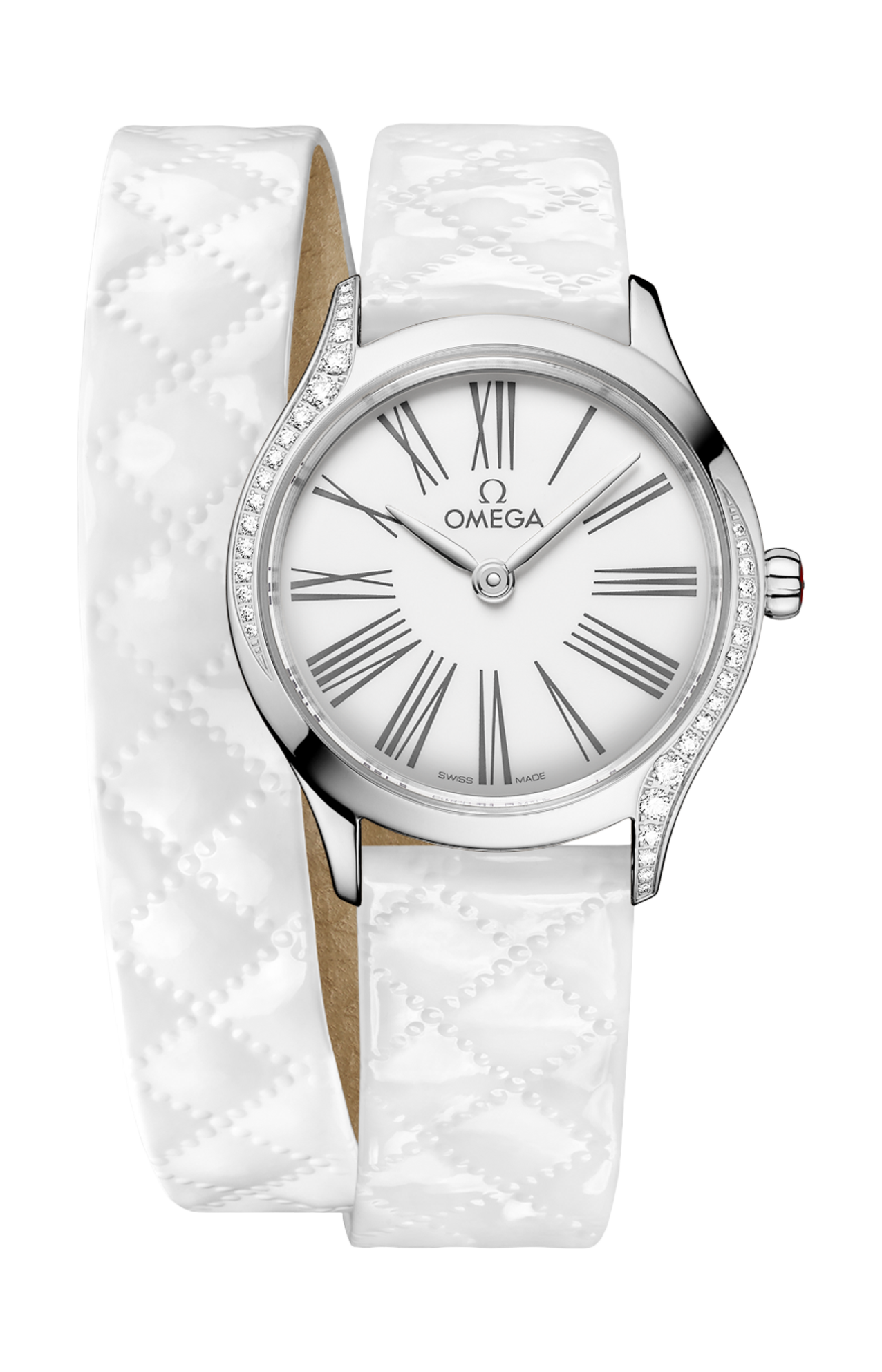 Corredato da un cinturino a doppio giro in pelle di vitello laccata bianca con trapuntatura a diamante, l’orologio è animato dal calibro Omega 4061, alloggiato nello speciale fondello a specchio con motivo metallizzato “Her Time”.