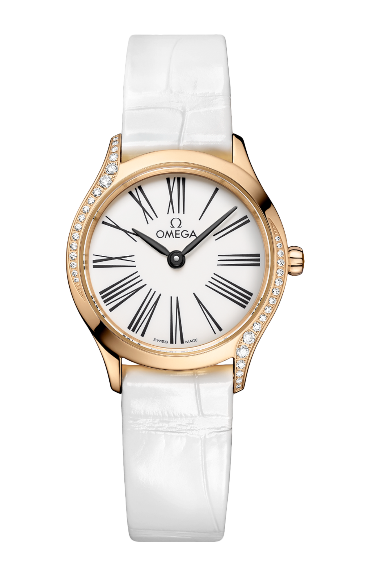 Corredato da un cinturino in pelle di alligatore laccata bianca con fibbia Trésor, l’orologio è animato dal calibro Omega 4061, alloggiato nello speciale fondello a specchio con motivo metallizzato “Her Time”.