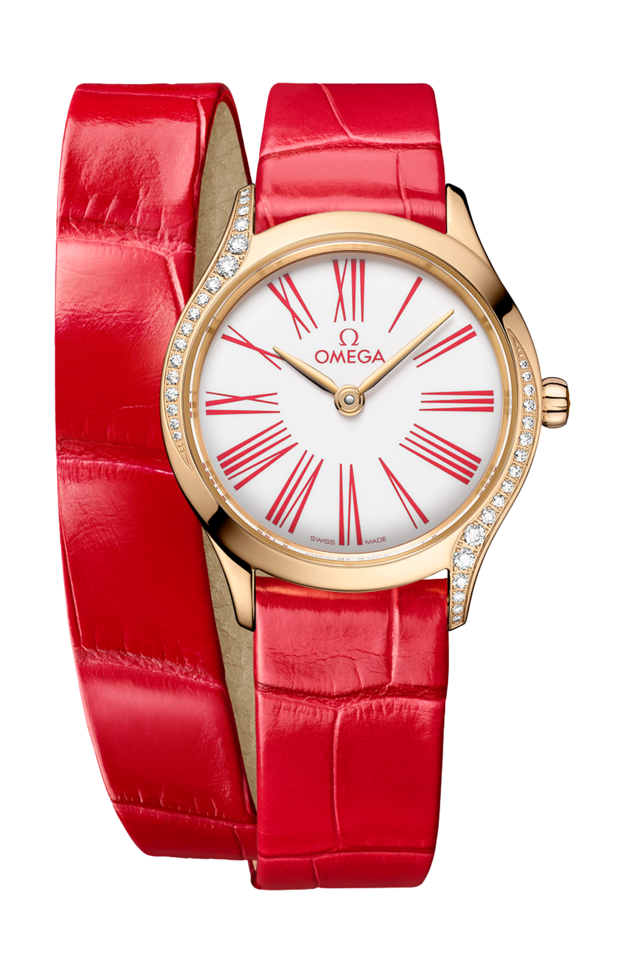 Corredato da un cinturino a doppio giro in pelle di alligatore laccata rossa con fibbia Trésor, l’orologio è animato dal calibro Omega 4061, alloggiato nello speciale fondello a specchio con motivo metallizzato “Her Time”.