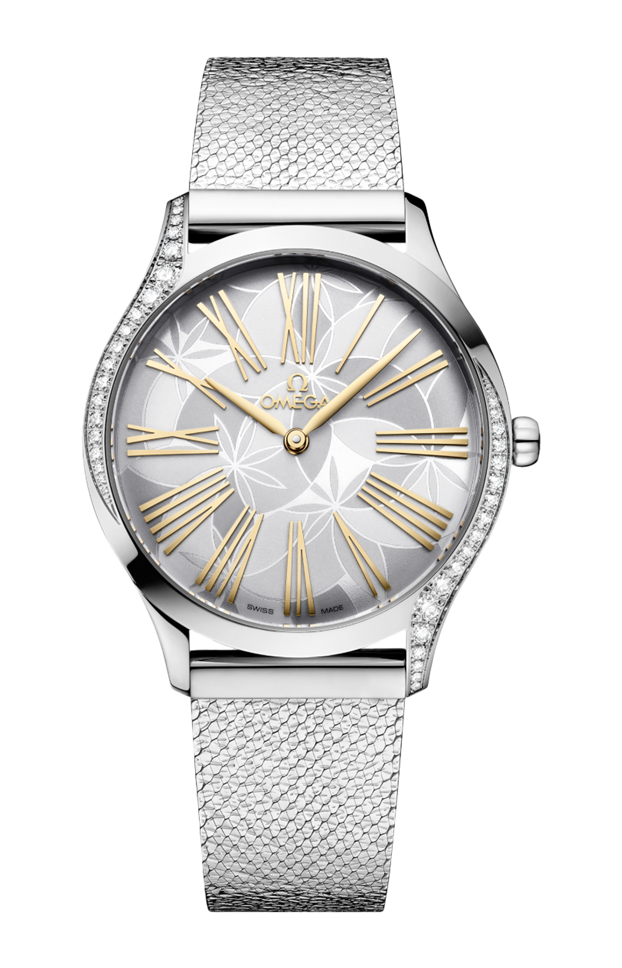 La cassa da 36 mm in acciaio inossidabile lucido vanta 38 diamanti taglio brillante (0,49 carati) che si snodano magnificamente creando una curva su ogni lato. Visibile sotto il vetro zaffiro bombato, il quadrante sabbiato argentato, ulteriormente sublimato da un motivo raffigurante dei frangipani ottenuto mediante una decorazione al laser. La corona è incastonata con un diamante taglio brillante, mentre le lancette, gli indici e il logo OMEGA sono in PVD oro Moonshine™.