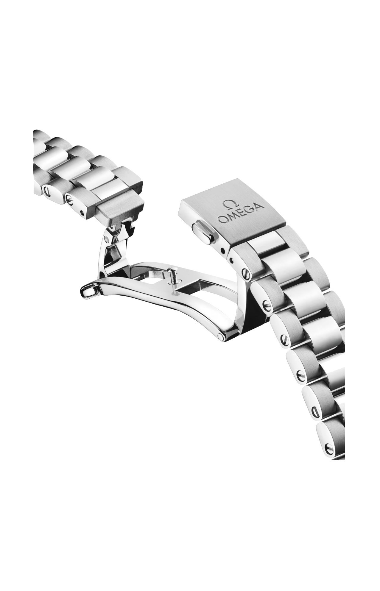 L’orologio è corredato da un bracciale integrato in acciaio inossidabile dotato di splendide maglie rotonde lucide e spazzolate, fibbia déployante con chiusura a farfalla e comodo sistema di regolazione Omega.