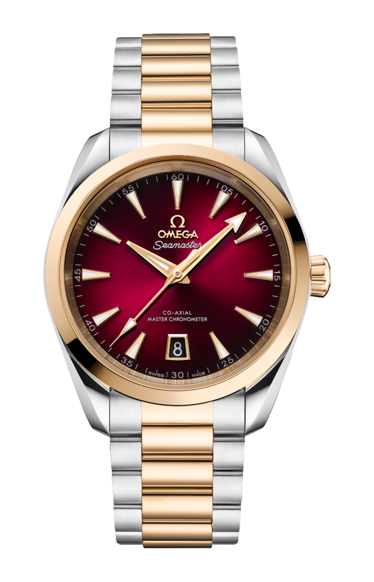 Il quadrante laccato bordeaux con finitura spazzolata ed effetto sfumato nero presenta il logo Omega in oro Moonshine™ 18K e datario a finestrella a ore 6. Le lancette e gli indici delle ore, anch’essi in oro Moonshine™ 18K, sono riempiti di Super-Luminova bianca, che emette una luminescenza blu.