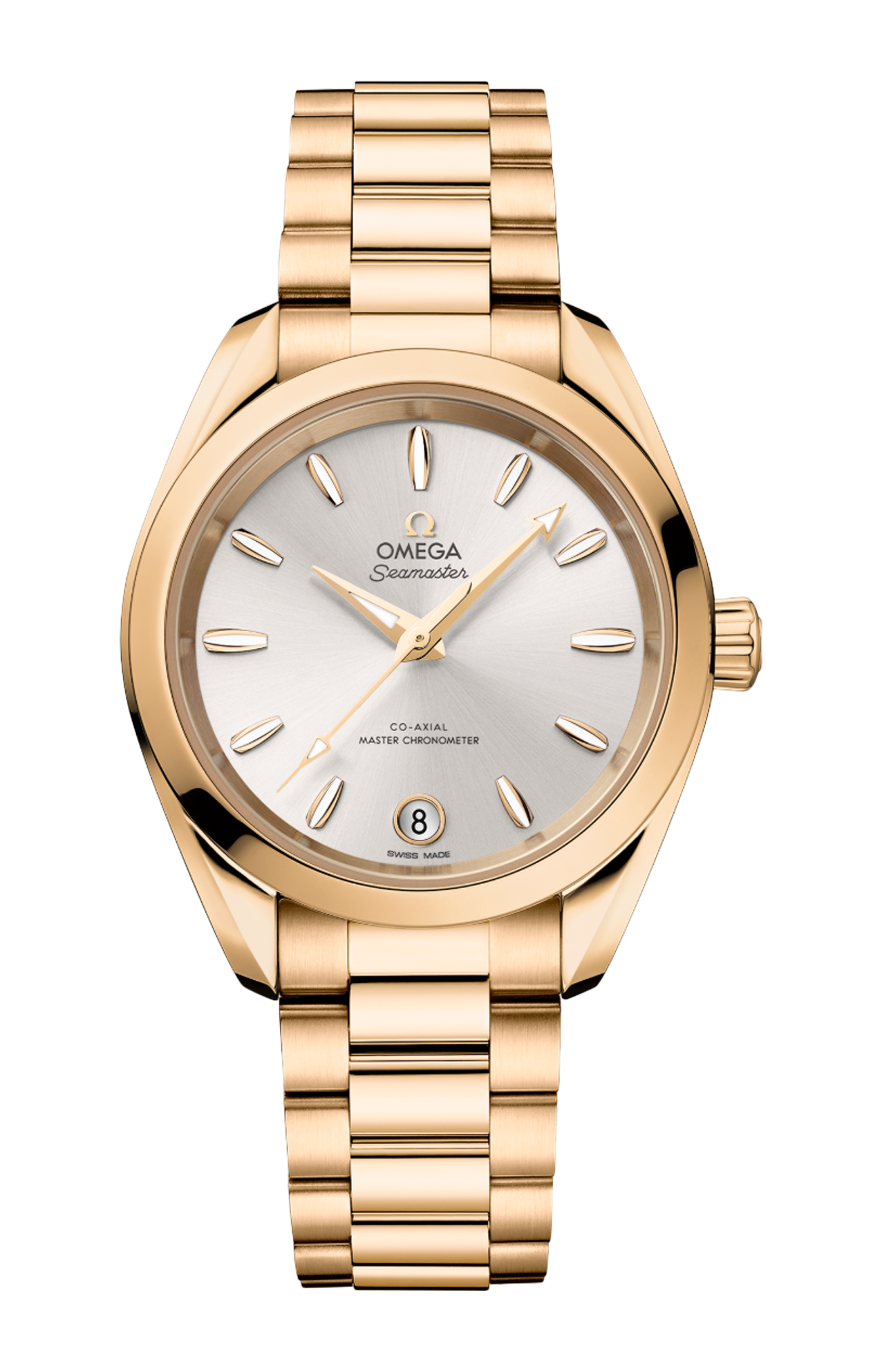 Questo modello da 34 mm in oro Moonshine™ 18K lucido presenta una corona conica e un fondello piatto in vetro zaffiro con bordo ondulato. Il quadrante spazzolato a raggi di sole e laccato argento presenta un datario a finestrella circolare a ore 6 incorniciato in oro Moonshine™ 18K. Omega ha scelto l’oro Moonshine™ 18K anche per le lancette sfaccettate e gli indici delle ore, dalla forma distintiva ispirata allo scafo di una barca a vela e riempiti di Super-Luminova bianca.