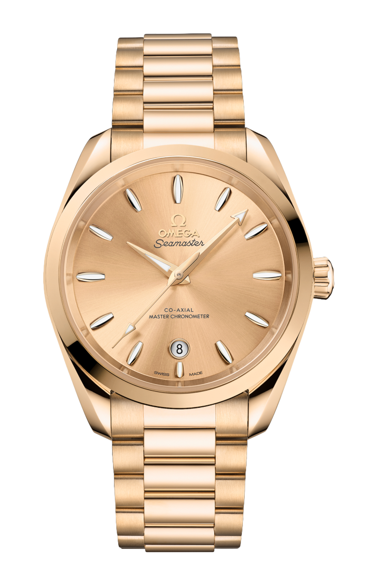 Questo modello da 38 mm in oro Moonshine™ 18K lucido presenta una corona conica e un fondello piatto in vetro zaffiro con bordo ondulato. Il quadrante spazzolato a raggi di sole, laccato e sottoposto a trattamento in PVD oro Moonshine™ presenta un datario a finestrella circolare a ore 6 incorniciato in oro Moonshine™ 18K. Omega ha scelto l’oro Moonshine™ 18K anche per le lancette sfaccettate e gli indici delle ore, dalla forma distintiva ispirata allo scafo di una barca a vela e riempiti di Super-Luminova bianca.