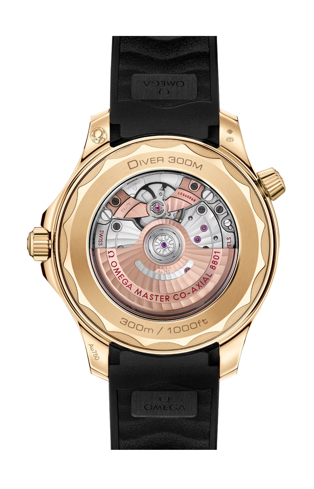 Corredato da un cinturino in caucciù nero, l’orologio è animato dal calibro Omega Master Chronometer 8801, visibile attraverso il fondello in vetro zaffiro con bordo ondulato.