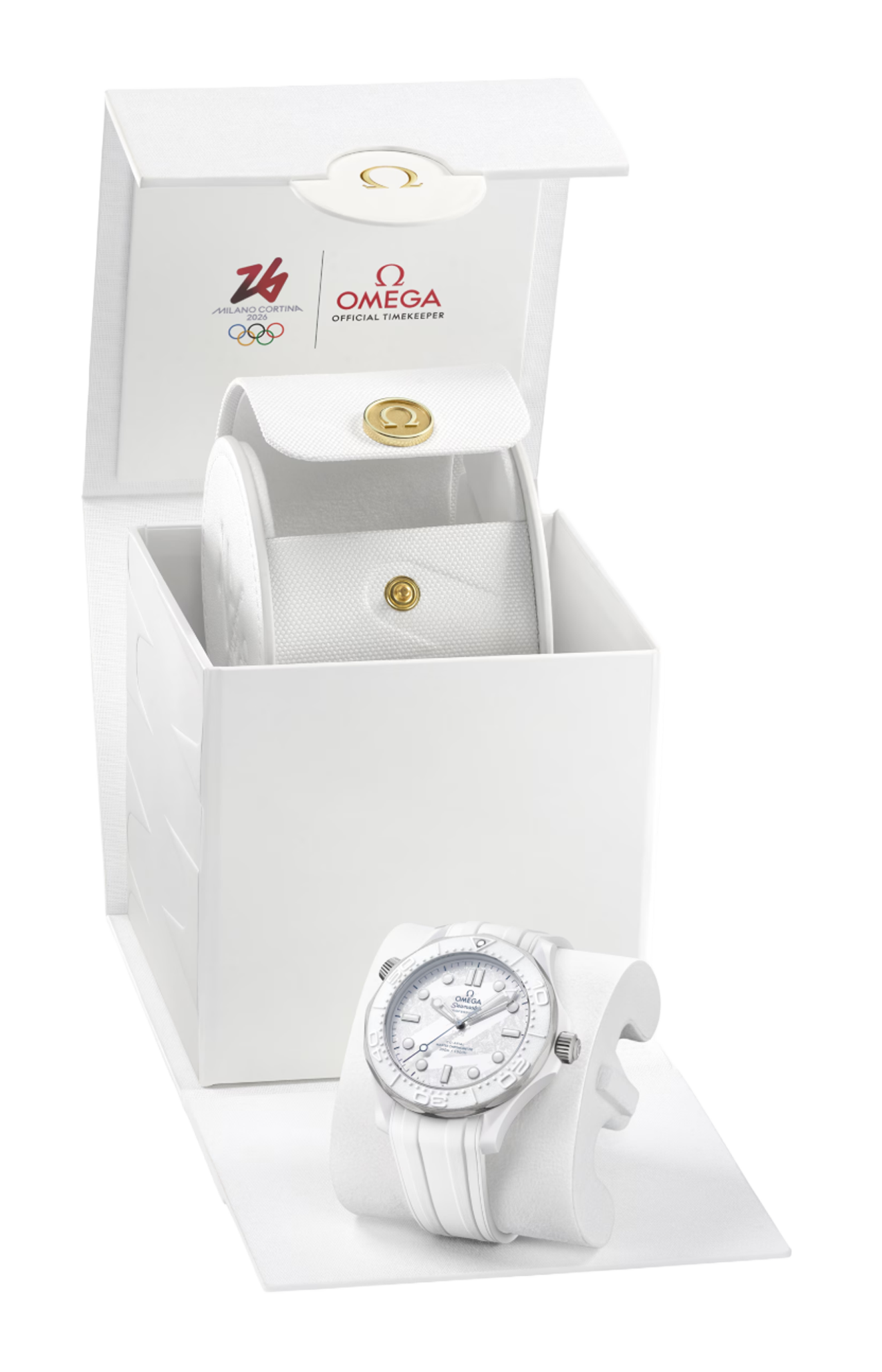 Racchiuso in uno speciale cofanetto di presentazione, l’orologio da 43,5 mm è realizzato in ceramica bianca e titanio grado 5. L’anello della lunetta in ceramica bianca rivela una scala d’immersione lavorata con ablazione al laser in rilievo positivo. Per creare un look invernale, il quadrante in ceramica bianca presenta un dettaglio applicato effetto ghiaccio inciso al laser, disegnato con un unico tratto continuo come se tracciato con un dito su un vetro appannato o sulla neve, richiamo al numero “26” del logo di Milano Cortina 2026. A completare il design del quadrante, le lancette e gli indici rodiati sono riempiti di Super-LumiNova bianca, mentre la lancetta dei secondi centrale presenta una delicata sfumatura blu.