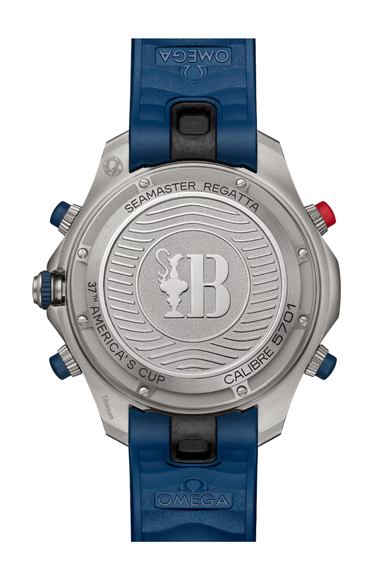Girando l’orologio, si scopre un fondello con motivo a onde progettato secondo i principi della “risonanza di Helmholtz”. È presente una cassa di risonanza che contribuisce ad aumentare il volume delle sveglie oltre a ricoprire diverse funzioni. Questa parte posteriore in rilievo svela l’iconico logo goffrato della 37a edizione dell’America’s Cup e le incisioni Seamaster Regatta e 37th America’s Cup. È inciso inoltre il nome del nuovo movimento al quarzo multifunzionale dell’orologio: Omega’s Calibre 5701.