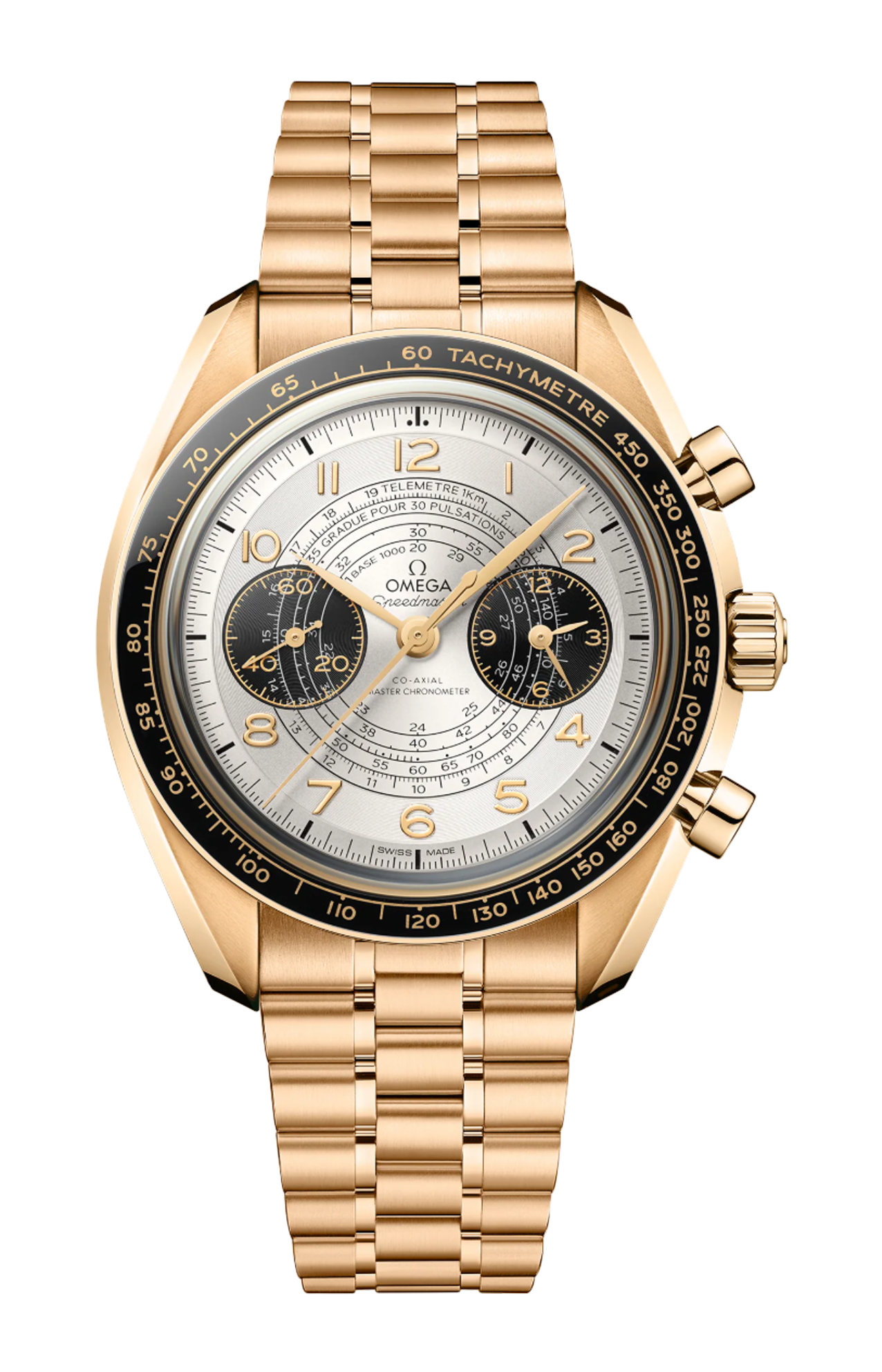 Corredato da un bracciale in oro Moonshine™ 18K con comodo sistema di regolazione brevettato Omega, l’orologio presenta un contatore dei piccoli secondi a ore 9 e contatori delle 12 ore e dei 60 minuti a ore 3. Il segnatempo è animato dal calibro Omega Co-Axial Master Chronometer 9909.