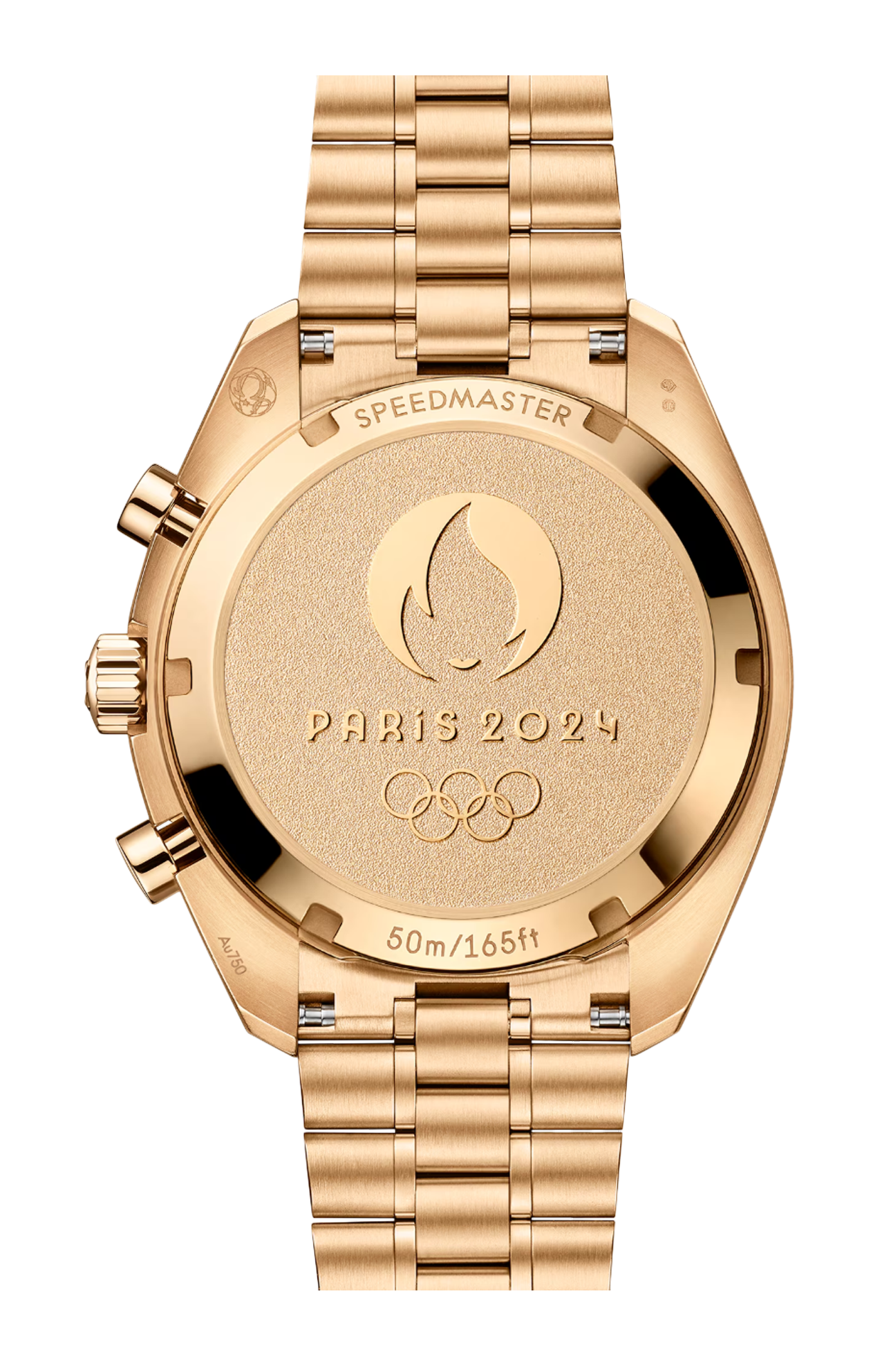 Sul retro, il fondello commemorativo in oro Moonshine™ 18K rivela un medaglione stampato con base smerigliata e logo di Parigi 2024 lucidato a specchio, con la scritta “Paris 2024” e i cerchi olimpici.
