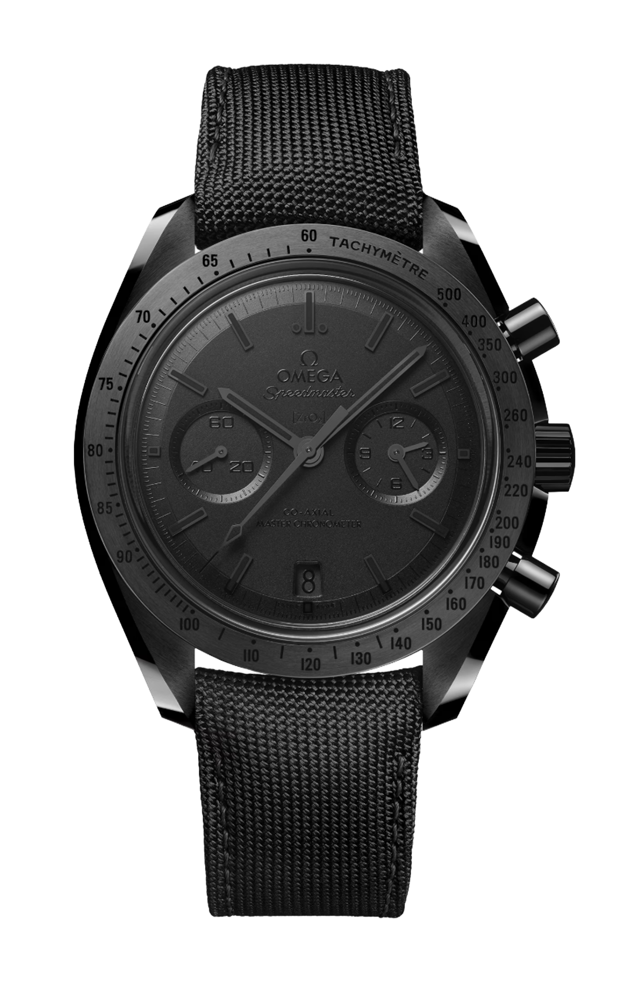 Visibile attraverso il fondello, il calibro Co-Axial Master Chronometer 9900 a carica automatica di OMEGA presenta una speciale finitura opaca brunita sul rotore, sulla platina principale e sui ponti, nonché incisioni laccate nere. L’orologio è corredato da un cinturino in nylon nero con una fibbia déployante in ceramica e componenti incernierati a molla realizzati in titanio ceramizzato.