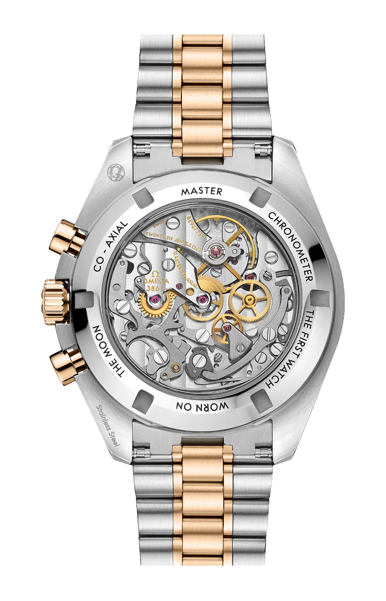 Questo modello bicolore da 42 mm in acciaio inossidabile e oro Moonshine™ 18K presenta quadrante e fondello in vetro zaffiro. Ispirato alla quarta generazione di Speedmaster indossata sulla Luna, sfoggia una cassa asimmetrica con anello della lunetta in ceramica nera e il celebre “Dot over 90” in Ceragold™ Omega sulla scala tachimetrica.