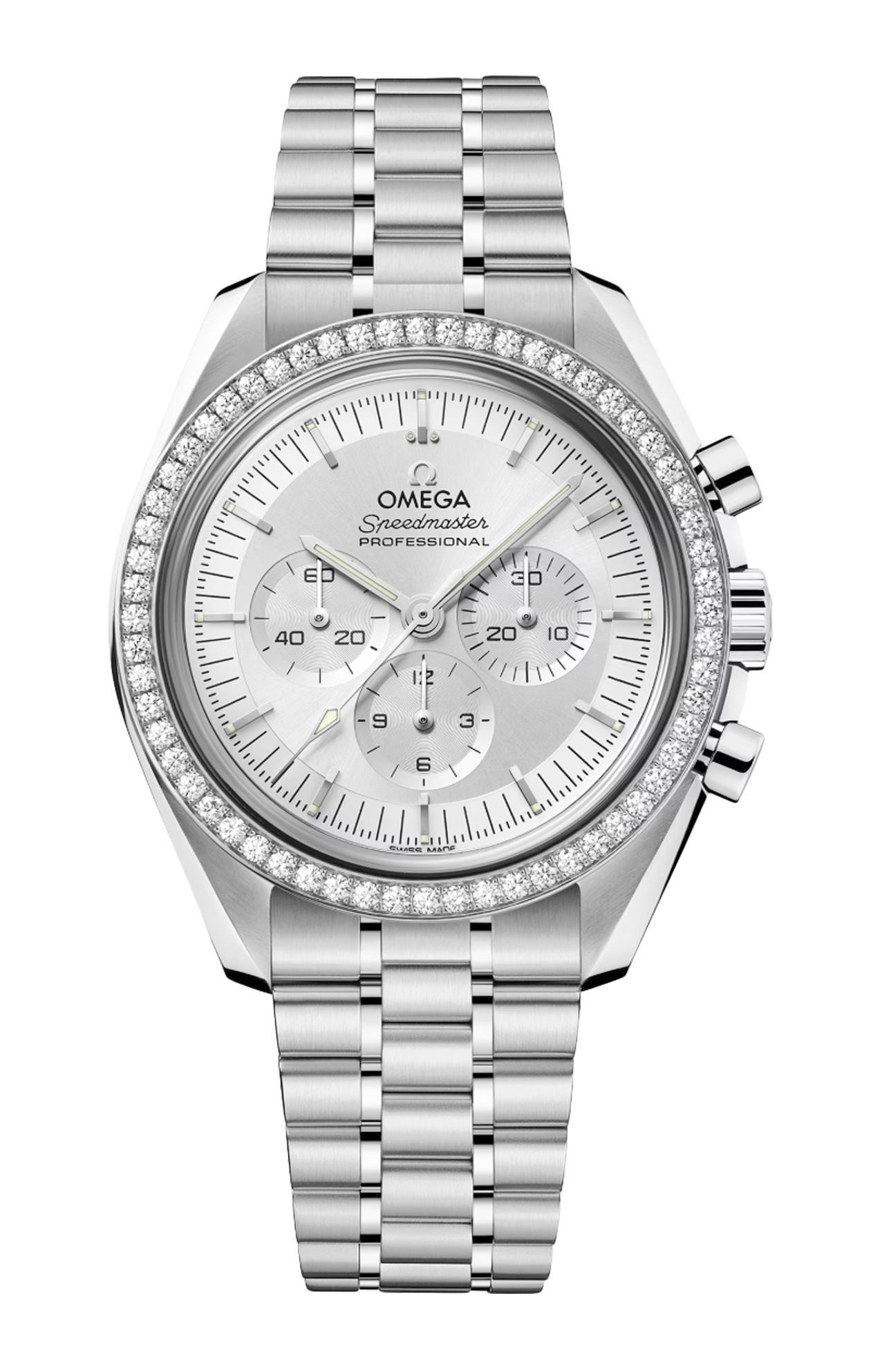Corredato da un bracciale a 5 maglie incurvate per fila, questo Moonwatch da 42 mm in oro Canopus Gold™ 18K presenta quadrante e fondello in vetro zaffiro. Ispirato allo Speedmaster di quarta generazione indossato sulla Luna, si caratterizza per la cassa asimmetrica con quadrante argentato con finitura spazzolata e la lunetta tempestata di diamanti.
