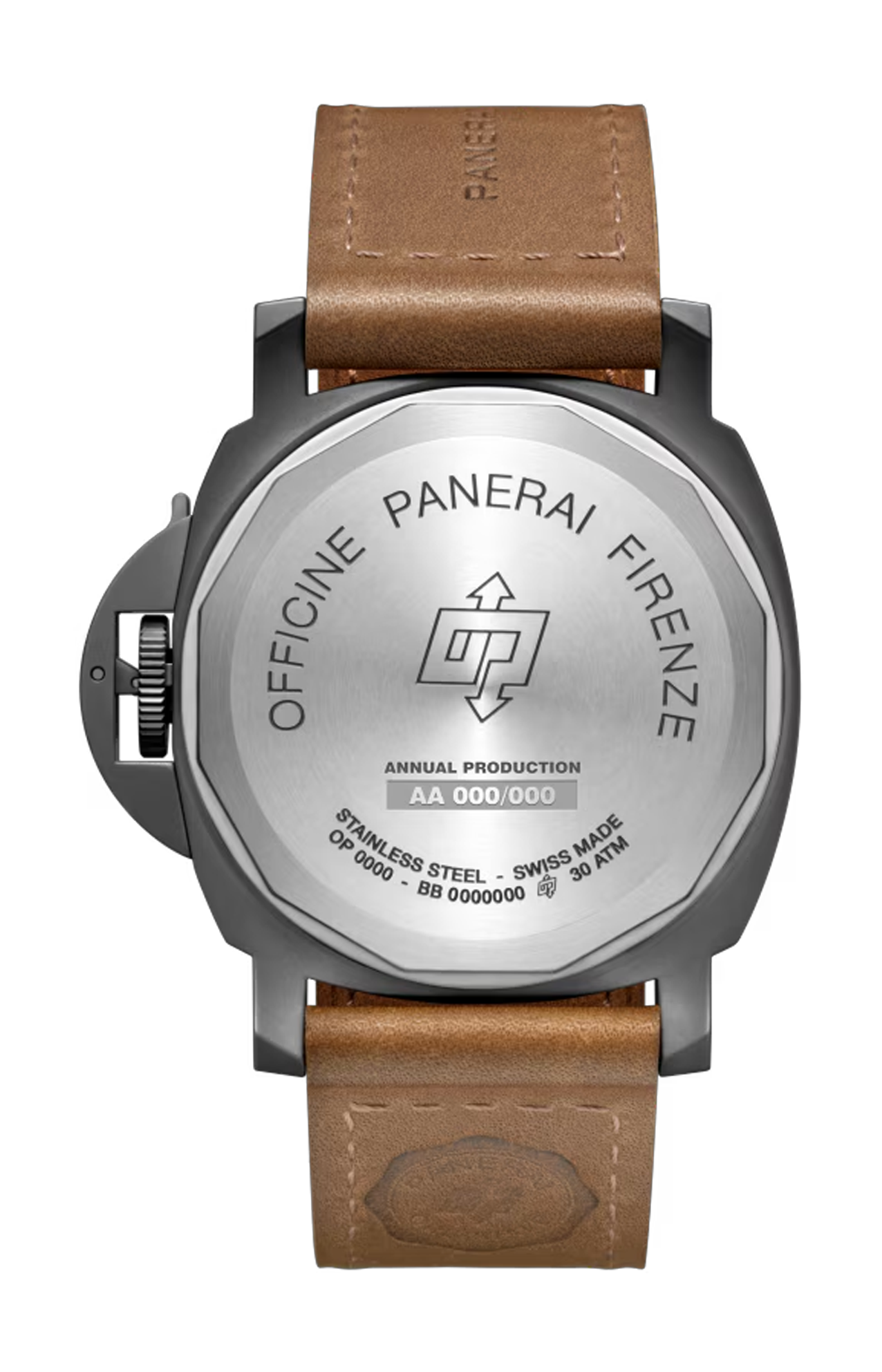 Movimento calibro meccanico a carica manuale P.6000, 15½ linee, 4,5 mm di spessore, 19 rubini, 21.600 alternanze orarie. Dispositivo antiurto Incabloc®. Un bariletto. 110 componenti. Funzioni ore, minuti. Riserva di carica 3 giorni. Cassa e lunetta in acciaio DLC. Fondello chiuso serrato a vite in acciaio, con dicitura Officine Panerai, logo OP e caratteristiche dell’orologio incise. Quadrante monostrato, inciso e svuotato, nero opaco con Super-Luminova® color caramello e dicitura Marina Militare a ore 6. Cinturino in pelle di vitello marrone dorato con cucitura tono su tono, fibbia trapezoidale in acciaio sabbiato nero DLC cucita al cinturino. Cinturino aggiuntivo in caucciÙ nero e fibbia di ricambio. ImpermeabilitÀ: 30 atmosfere (~300 metri).