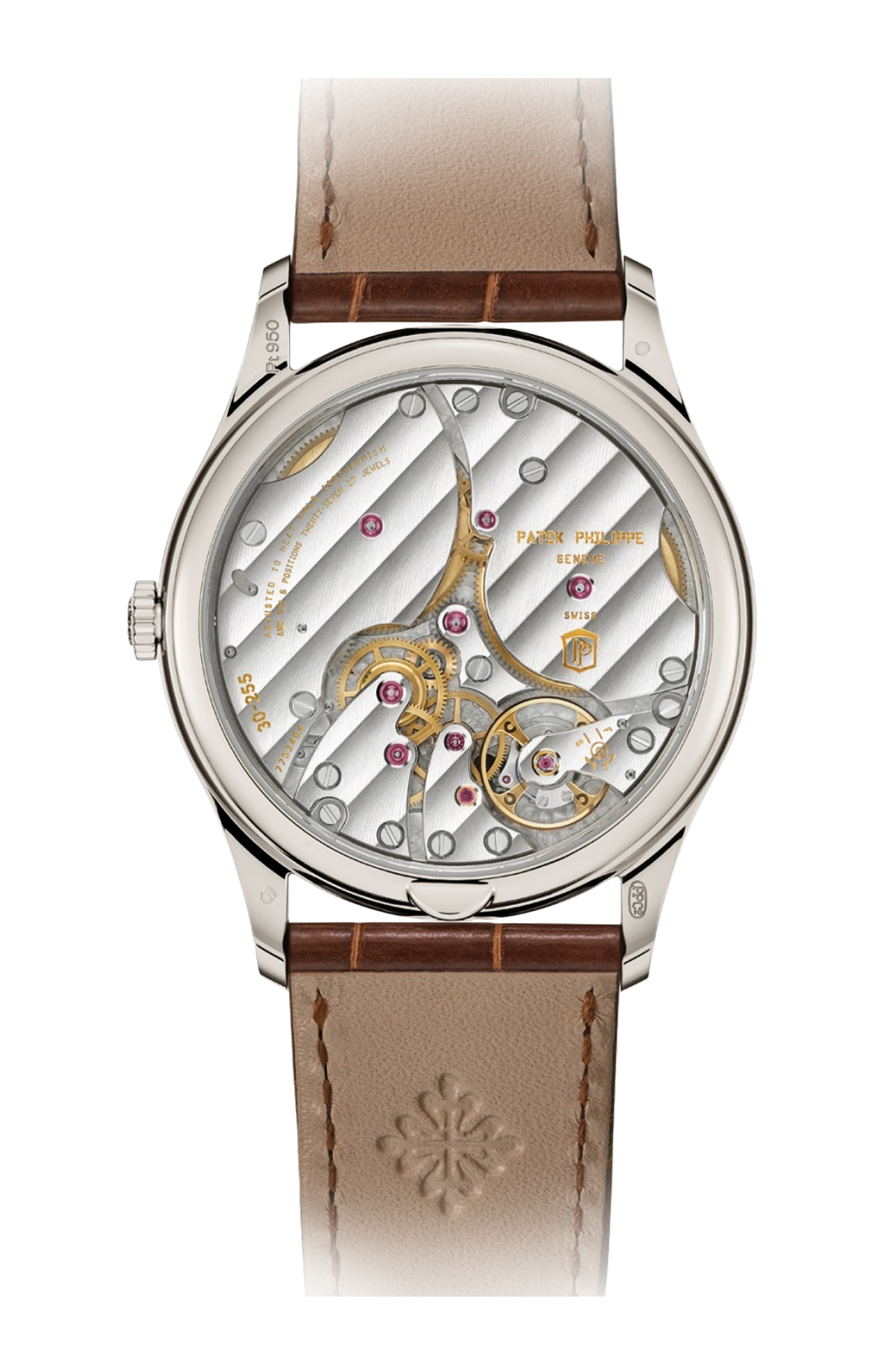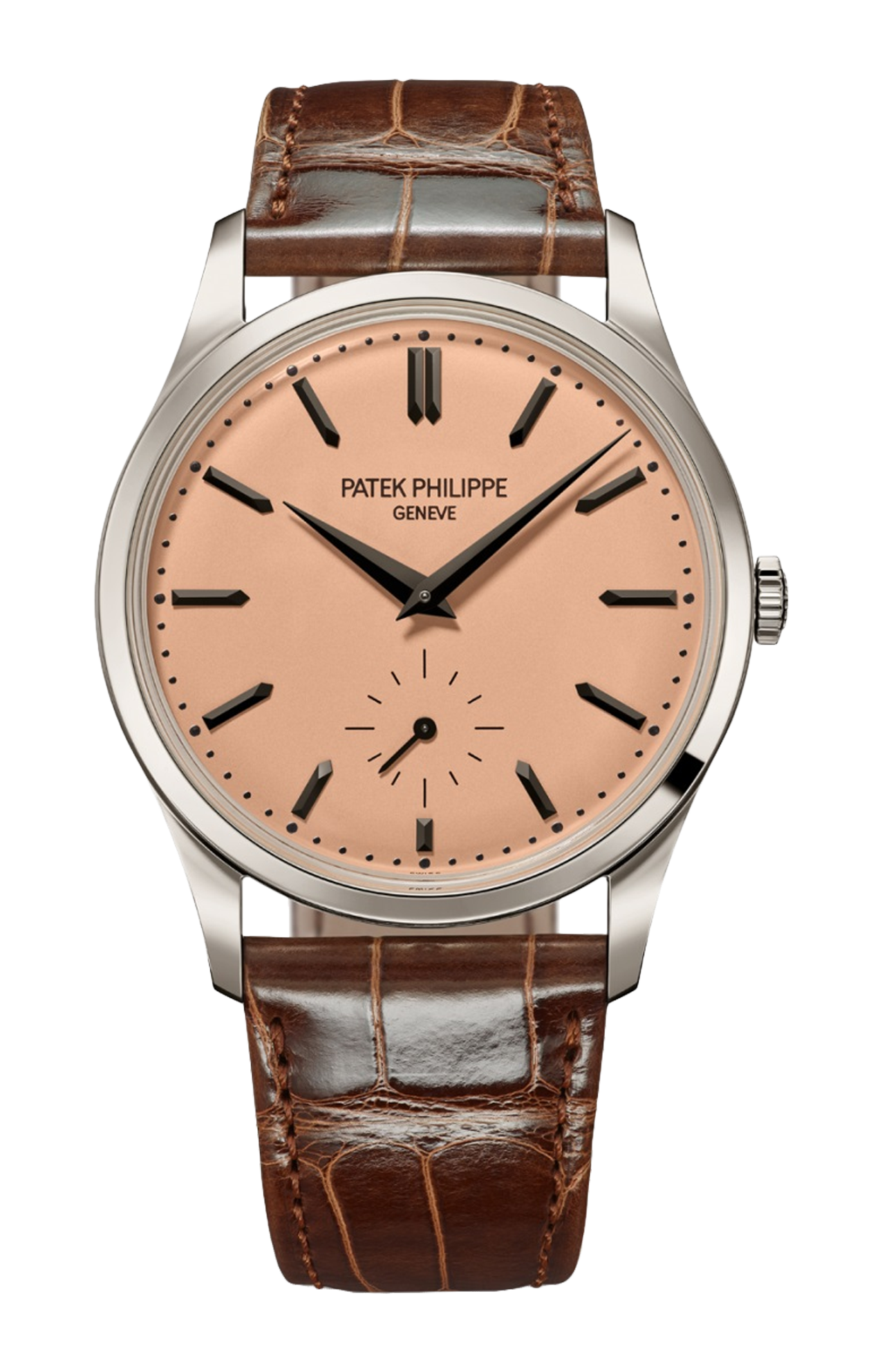 Quintessenza dell’eleganza senza tempo ed emblema perfetto dello stile Patek Philippe, la collezione Calatrava si arricchisce di un nuovo modello in platino, impreziosito dal tocco vintage di un quadrante opalino dorato in oro rosa dal design essenziale. La cassa lucida, di perfetta sobrietà, si distingue per la sua lunetta liscia e smussata, i fianchi satinati e le anse slanciate che si integrano armoniosamente con il cinturino in alligatore bruno cioccolato lucido. La corsa del tempo è scandita dal calibro 30-255 PS a carica manuale con riserva di carica di 65 ore e sistema “stop secondi” che consente una regolazione dell’ora al secondo.