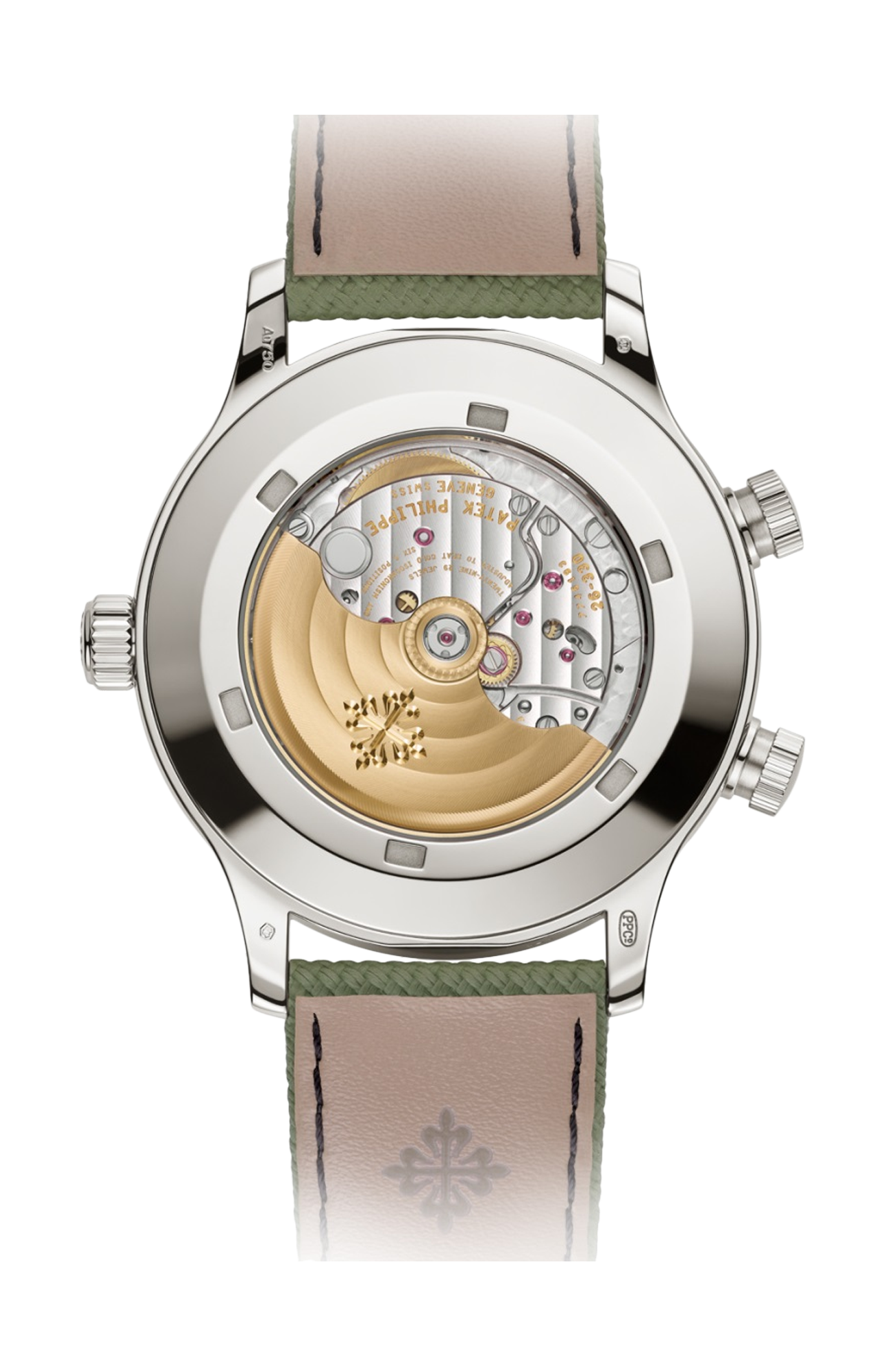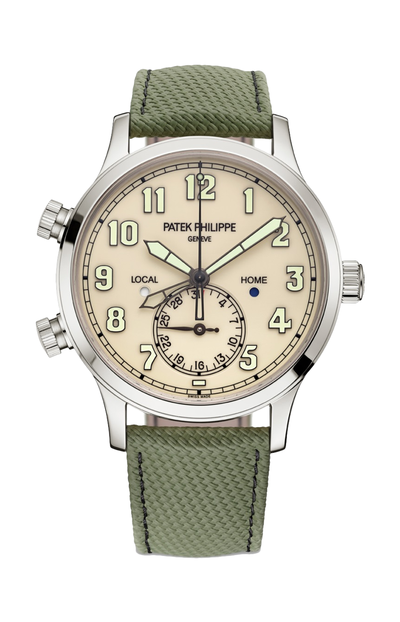 Patek Philippe reinterpreta il Calatrava Pilot Travel Time in oro bianco dotandolo di un elegante quadrante laccato avorio dal tocco vintage e di un cinturino in materiale composito verde kaki con motivo tessile. Nel cuore di questo orologio da viaggio originale, elegante e dalla forte personalità, batte il calibro 26-330 S C FUS, un movimento a carica automatica che vanta un sistema di visualizzazione del secondo fuso orario che si contraddistingue per la sua estrema semplicità di utilizzo. La visualizzazione della data a lancetta a ore 6 si regola automaticamente sull’ora locale, sia in avanti che indietro. I due pulsanti dei fusi orari dispongono di un sistema di sicurezza a vite brevettato che evita ogni modifica accidentale dell’ora locale.