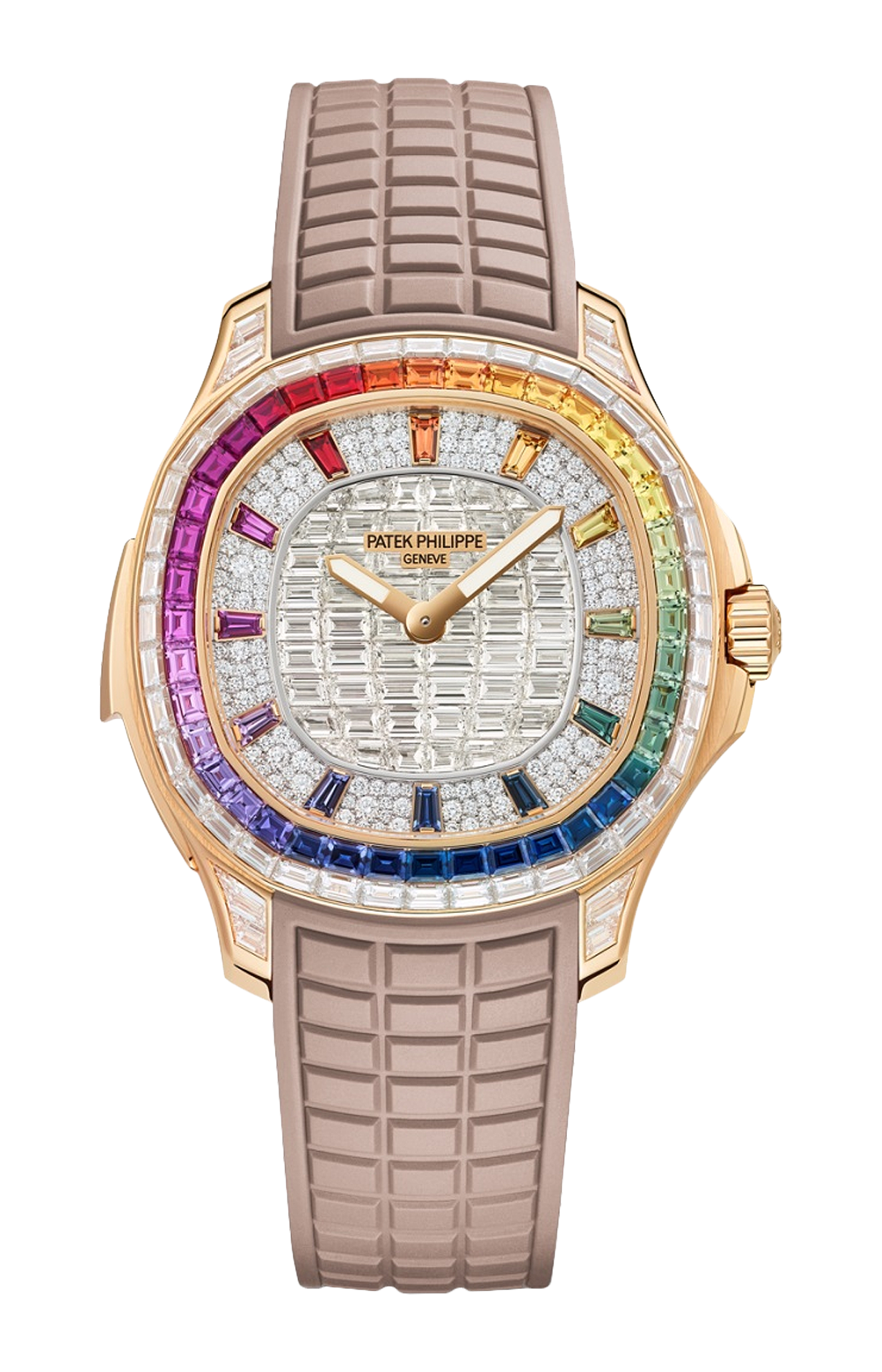 Primo Aquanaut Luce con ripetizione minuti, questo modello automatico è reso ancora più prezioso da 52 zaffiri multicolori a baguette (3,19 ct), 112 diamanti a baguette (7,31 ct) e 160 diamanti taglio brillante (0,72 ct). L’originalità della forma della lunetta è esaltata da una doppia fila di diamanti e zaffiri multicolori con “incastonatura invisibile”. Il quadrante combina un centro con pavé di diamanti a baguette “incastonatura invisibile” con un giro delle ore adornato di brillanti “effetto neve”. I 12 indici di zaffiri multicolori riprendono l’arcobaleno della lunetta. Questo orologio è fornito con tre cinturini in materiale composito ultraresistente nei colori beige opaco, bianco opaco e rosso, con fermaglio déployant brevettato in oro rosa tempestato di diamanti a baguette.