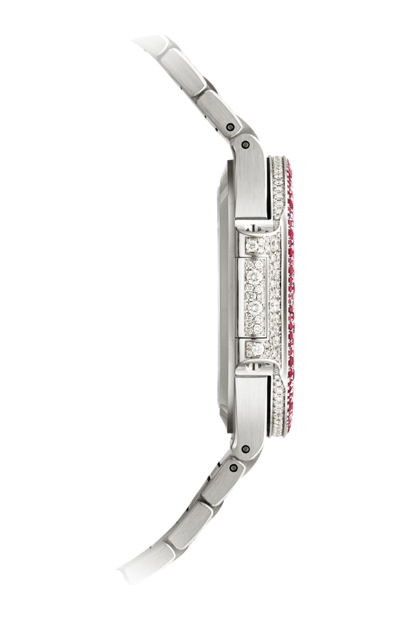 Patek Philippe dispiega tutta la propria sapiente arte di incastonatura in un nuovo Nautilus Haute Joallerie da donna in oro bianco tempestato di 1500 diamanti taglio brillante (6,53 ct) e 876 rubini (6,58 ct). Per conferire a questa preziosa parure una brillantezza senza pari, la manifattura ha scelto di affidarsi alla sofisticatissima tecnica di incastonatura “effetto neve”. Il quadrante in oro bianco non passa inosservato grazie alle sue file di diamanti taglio brillante disposte secondo il tipico motivo a piccole onde della collezione Nautilus da donna. Il calibro 26-330 S a carica automatica è visibile attraverso il fondo in cristallo di zaffiro trasparente. Il bracciale è dotato di un fermaglio déployant brevettato Patek Philippe, reso sicuro da quattro punti di attacco indipendenti.