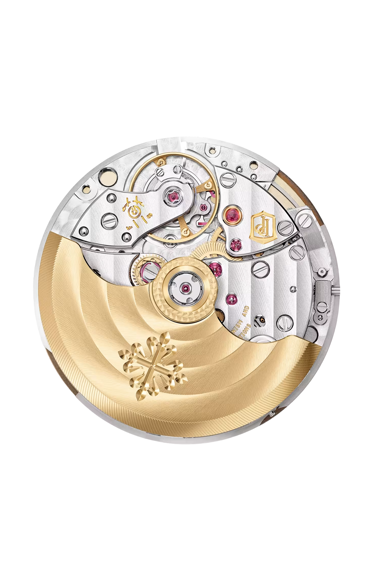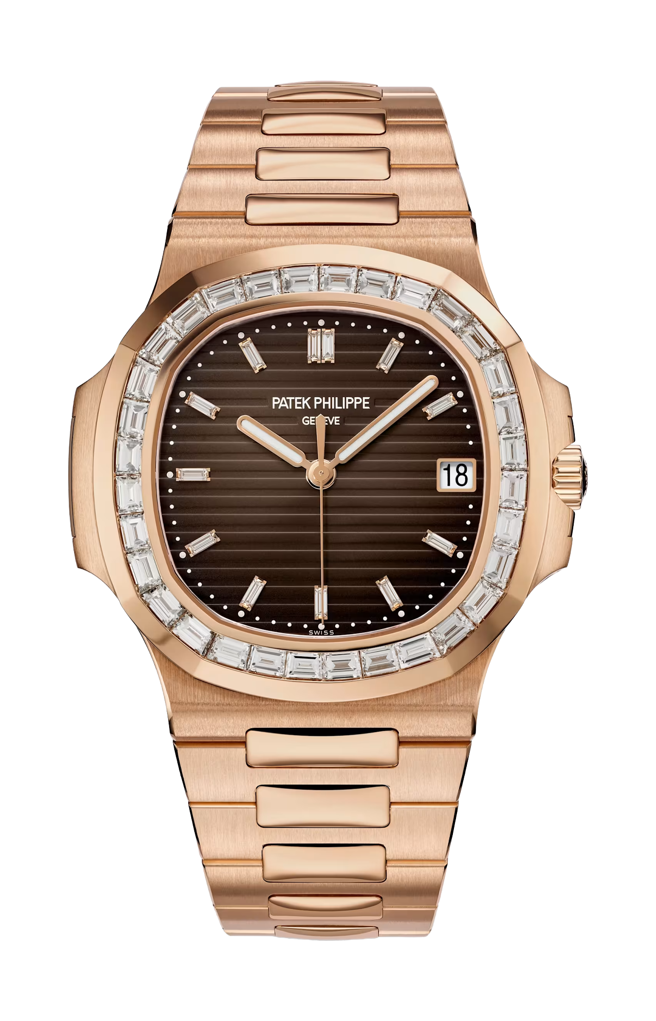 La Manifattura impreziosisce il design del Nautilus con una cassa in oro rosa e una lunetta incastonata con 32 diamanti taglio baguette (3,79 ct). Questa eccezionale raffinatezza è ulteriormente accentuata dal quadrante marrone con finitura a raggio di sole, bordo sfumato nero e motivo orizzontale in rilievo. Il calibro a carica automatica 26-330 S C, dotato di meccanismo di arresto dei secondi, anima questa icona di eleganza sportiva.
