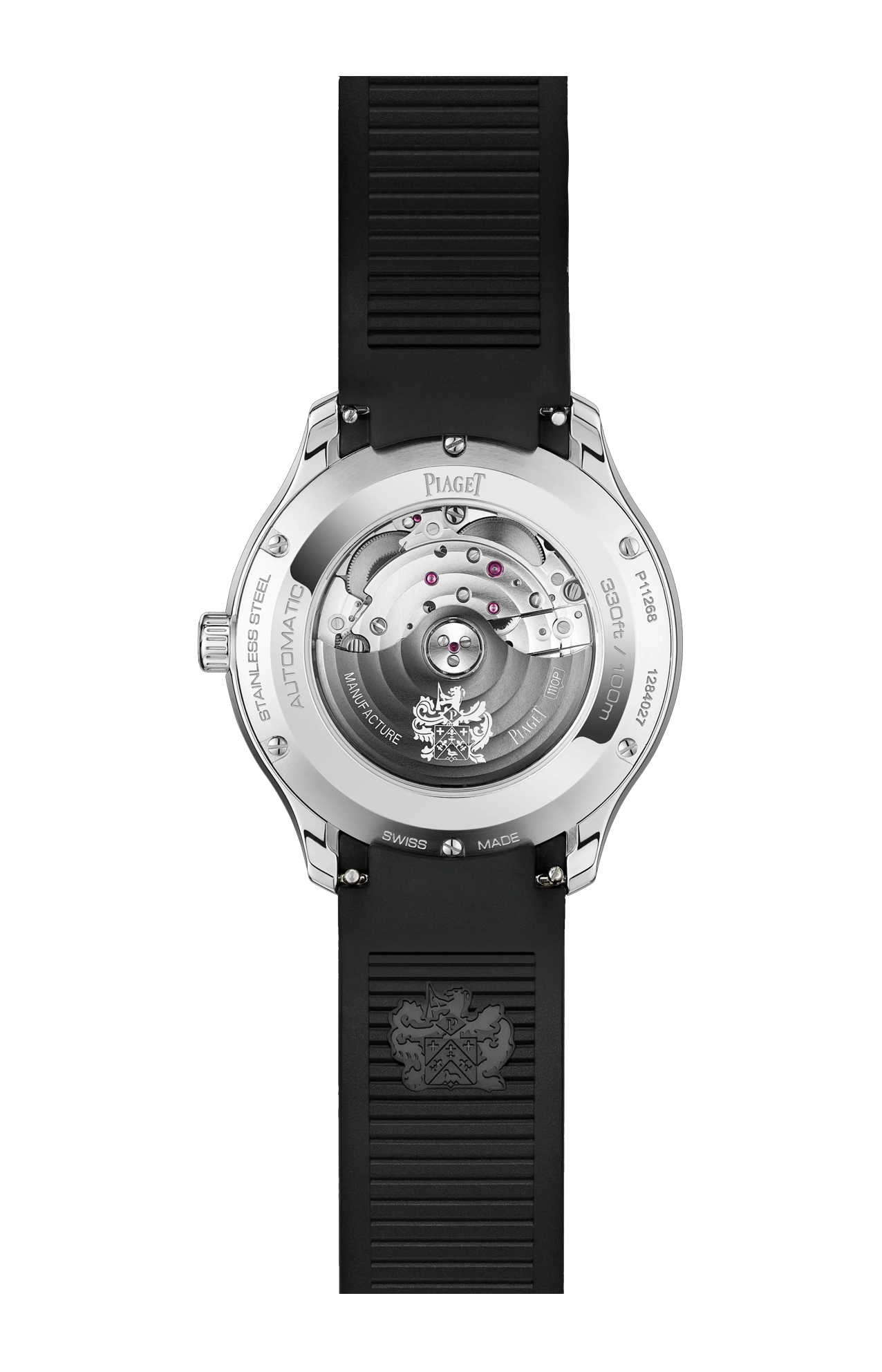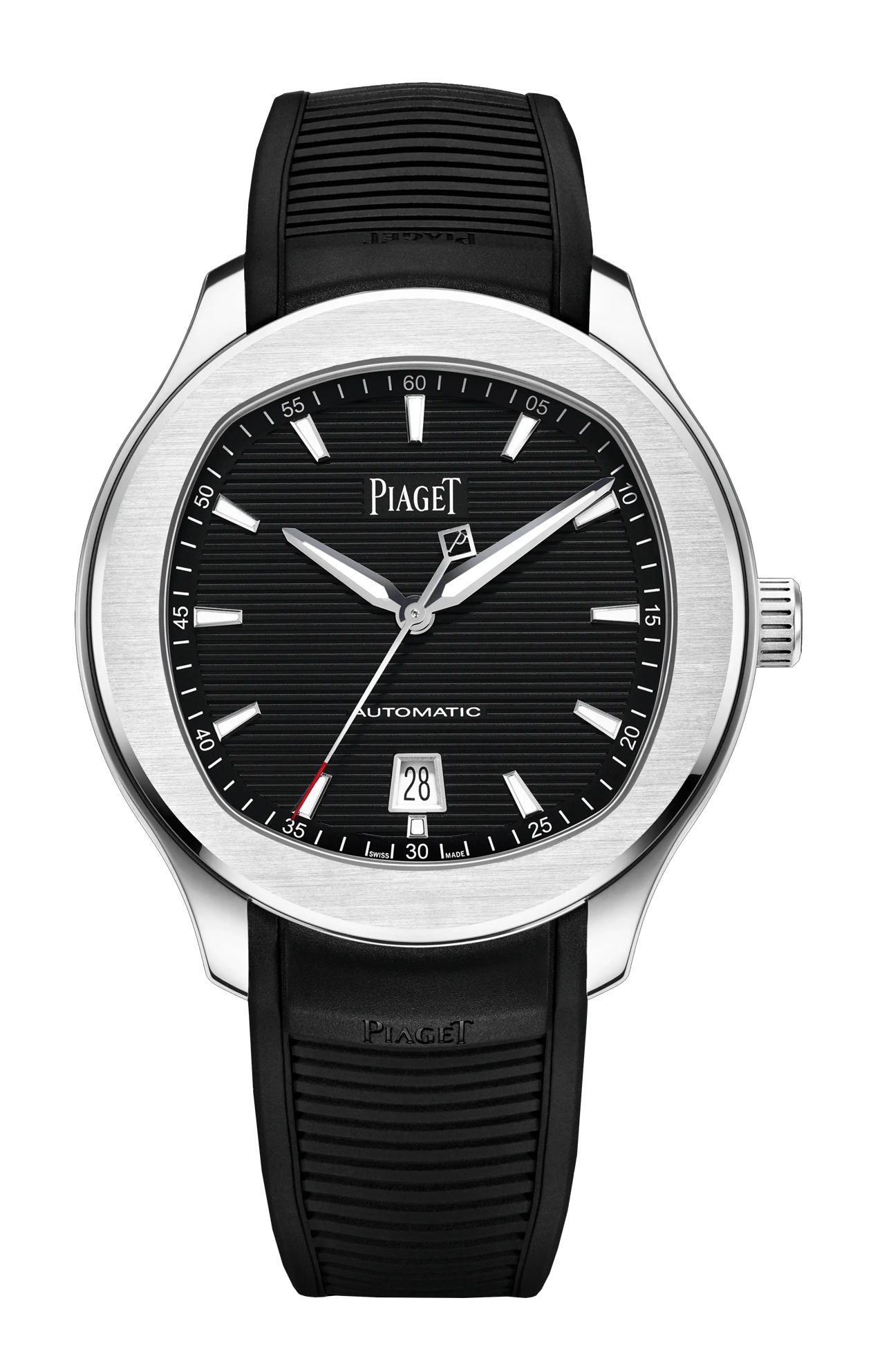 Orologio Piaget Polo Date, 42 mm. Cassa in acciaio. Fondello in vetro zaffiro. Cinturino in caucciù intercambiabile. Movimento meccanico automatico di manifattura 1110P.