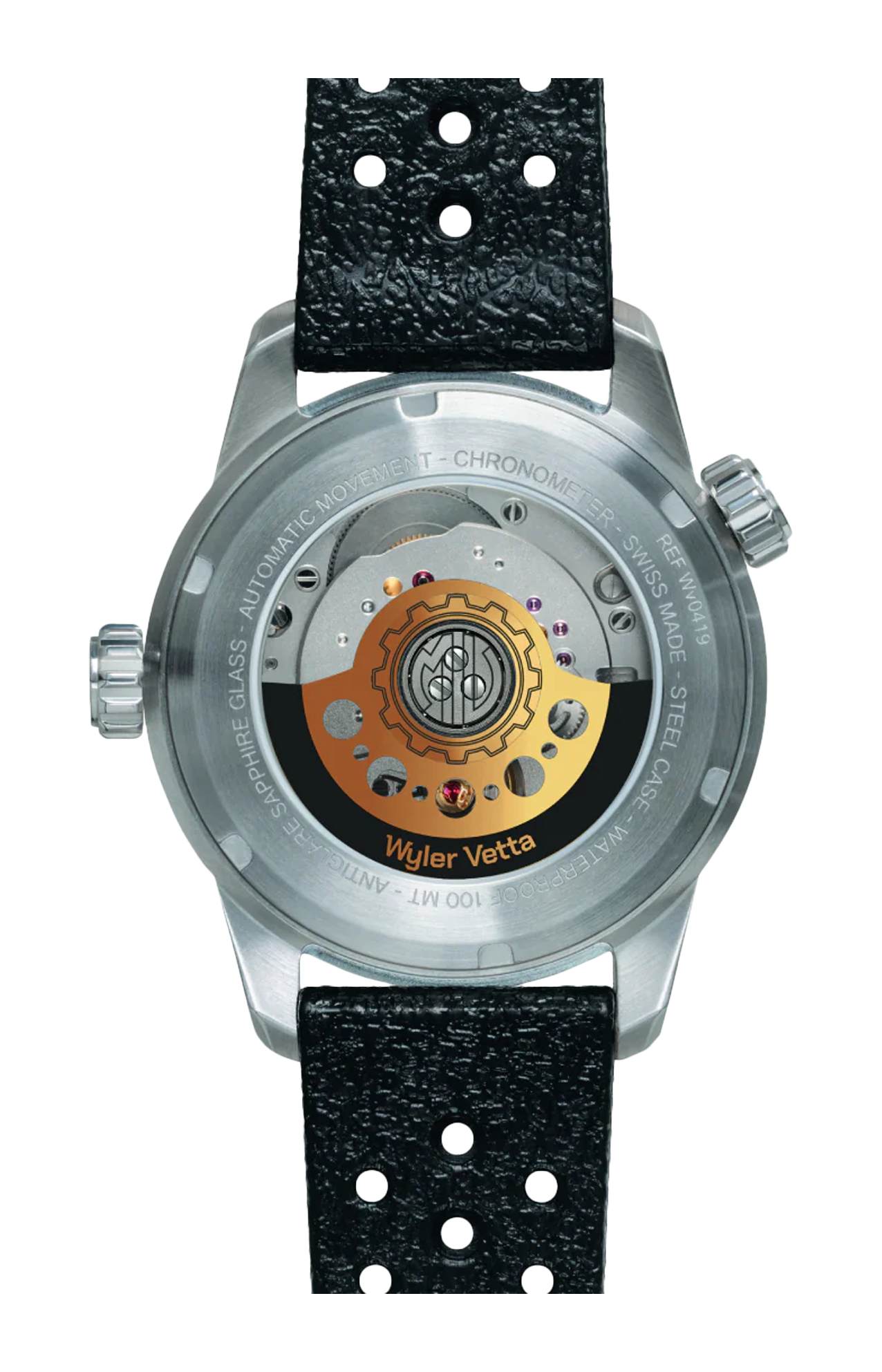 La cassa misura 10,9mm di spessore ed è estremamente confortevole nell'indosso, pur mantenendo tutta la forza estetica del binomio Wyler Vetta - MV Agusta. Il fondello in vetro zaffiro, che riporta al centro il logo inciso MV, rende visibile il movimento La Joux Perret G100, con rotore in alluminio anodizzato oro e nero. Secondo cinturino incluso in pelle color cuoio con sgancio rapido. Edizione limitata a 500 esemplari.