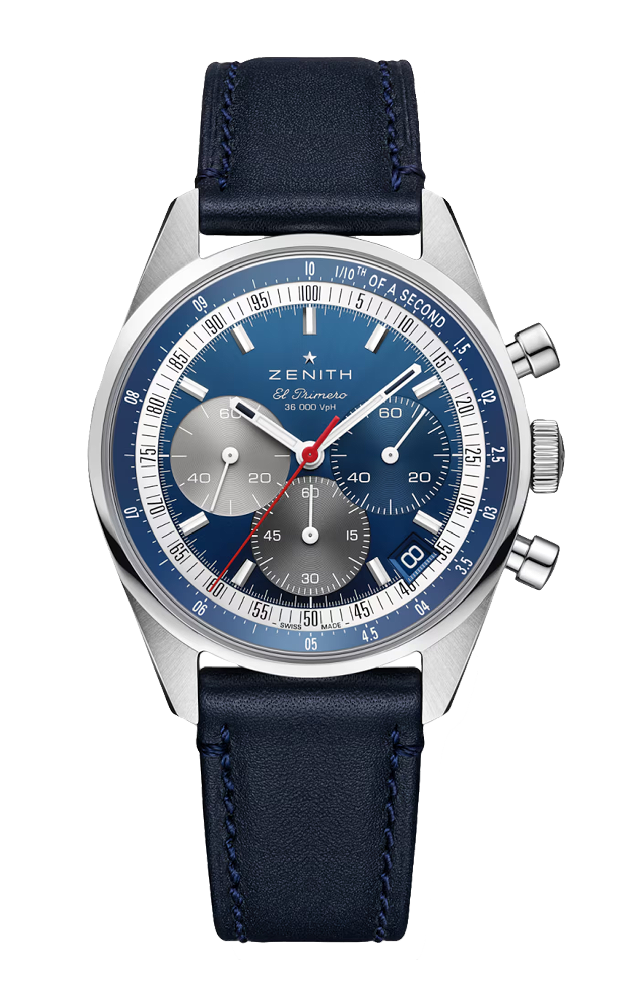 Il Chronomaster Original ritorna con un quadrante blu, il colore simbolo di Zenith e, per la prima volta, presenta contatori tricolori. Fedeli riproduzione della referenza A386 originale del 1969, uno dei primi orologi dotati del calibro El Primero, l’ultima reinterpretazione integra la moderna evoluzione del movimento, in grado di misurare e mostrare il tempo trascorso con precisione al 1/10 di secondo. Elegante e moderno, questo iconico cronografo ad alte prestazioni offre una precisione impareggiabile e uno stile senza tempo, con due opzioni di cinturino: un cinturino in pelle di vitello blu e un bracciale in acciaio inossidabile a tre maglie.