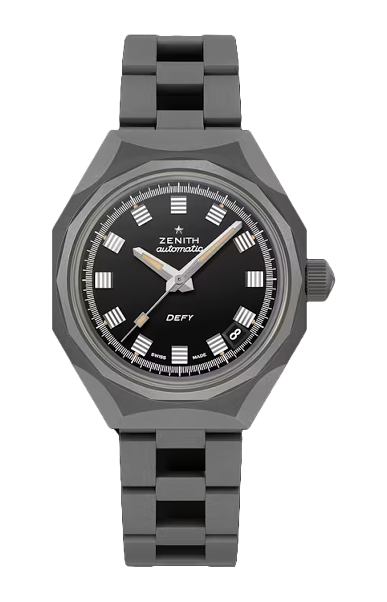 Una reinterpretazione in chiave moderna del primo orologio da polso DEFY del 1969. Dotato di una robusta cassa ottagonale in titanio dalla finitura opaca con lunetta a 14 lati, abbinata a un bracciale in titanio effetto “scala”. Il quadrante nero opaco aggiunge un tocco decisamente vintage. Il modello è animato dal movimento di manifattura automatico ELITE 670.