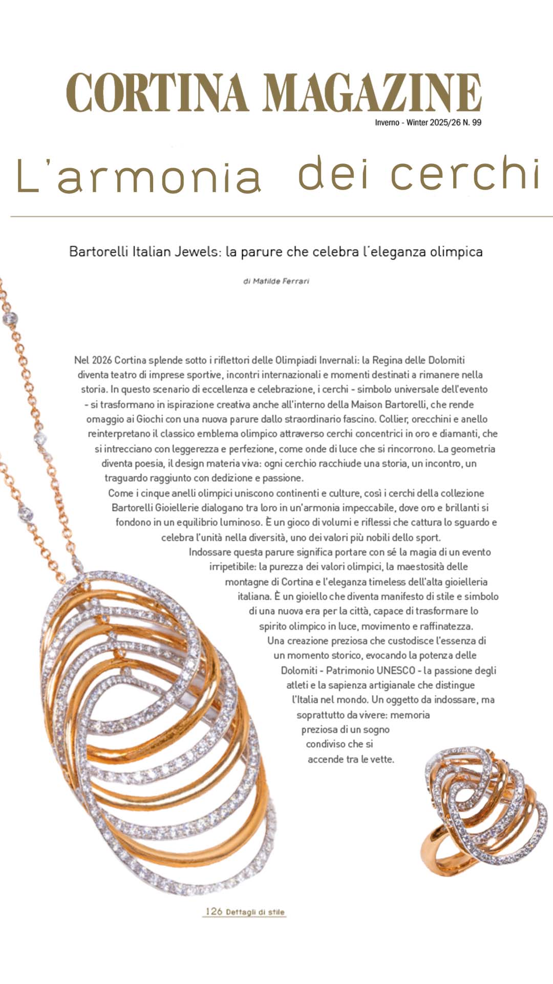 Siamo lieti di annunciare la pubblicazione su Cortina Magazine della nuova creazione esclusiva Bartorelli Italian Jewels: la parure “L’armonia dei cerchi”, un omaggio prezioso ai Giochi Olimpici Invernali di Cortina 2026.In un momento storico per la Regina delle Dolomiti, la Maison Bartorelli celebra l’eccellenza e la bellezza dei valori olimpici attraverso una collezione inedita di alta gioielleria. Anelli, collier e orecchini reinterpretano con eleganza i cerchi olimpici, simbolo di unione tra i popoli e di perfezione geometrica, fondendo oro e diamanti in un gioco di luce e armonia.